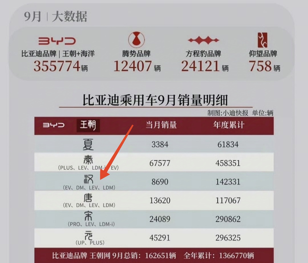 而9月销量也公布了,风云a9l和星耀8分别卖了10007辆和10018辆,而汉系列四款加起来才8690辆,差距可想而知,显然吉利和奇瑞的低价战略很成功。现在汉dm面临最大的对手就是风云a9l和星耀8,而汉L md和汉L EV面临最大的竞争对手更多,比如su7,model 3,小鹏p7,星纪元ES等。
