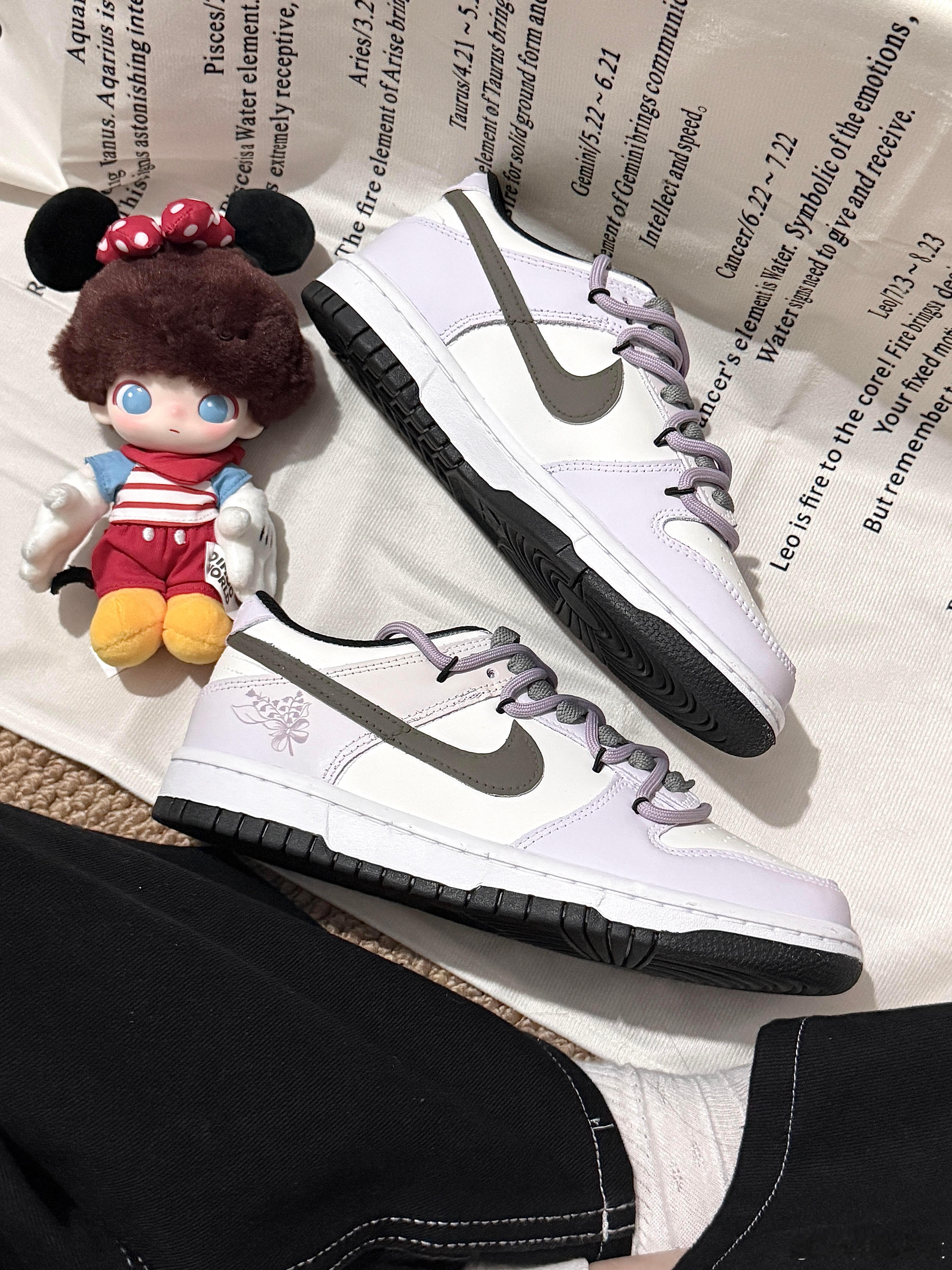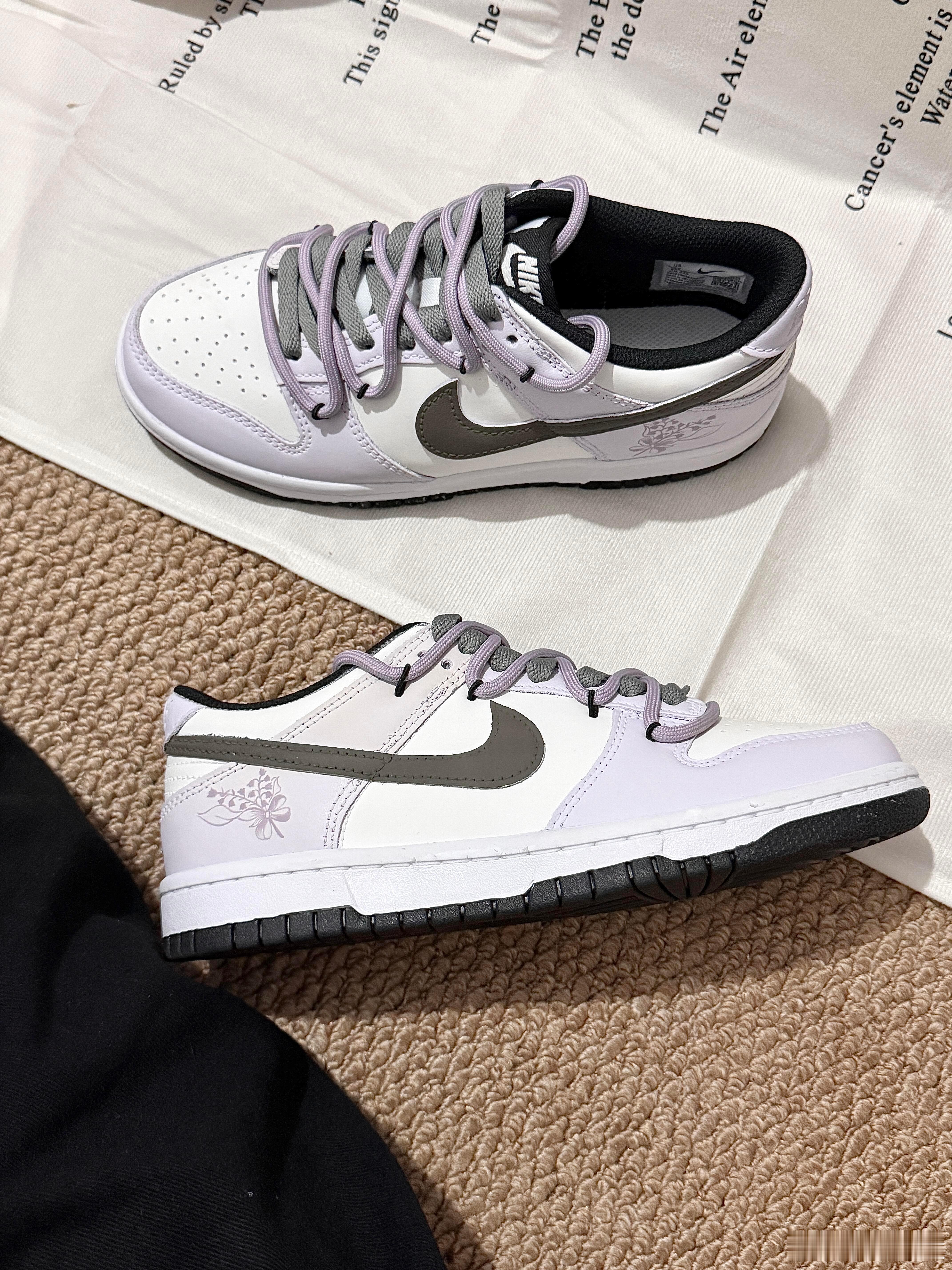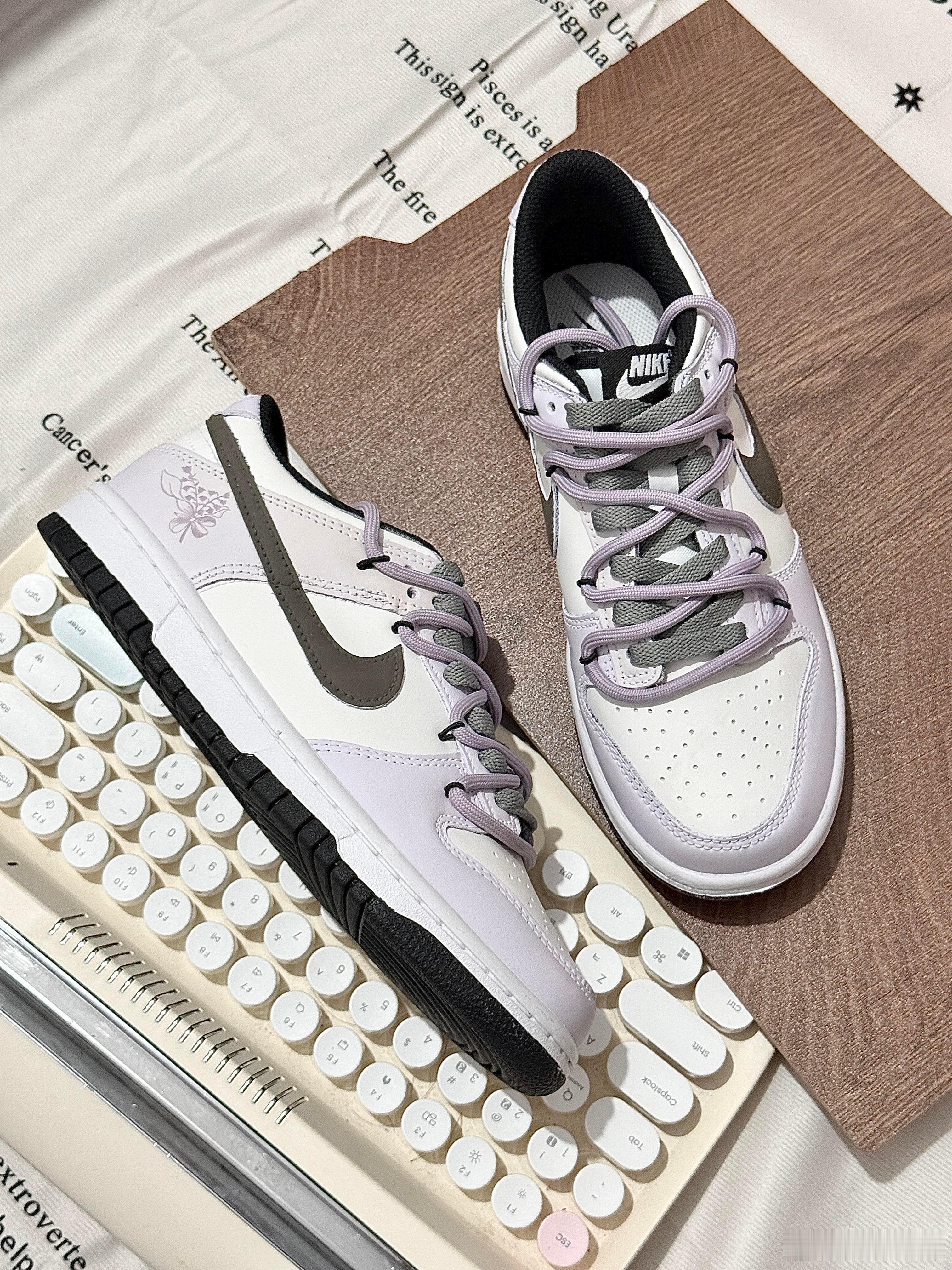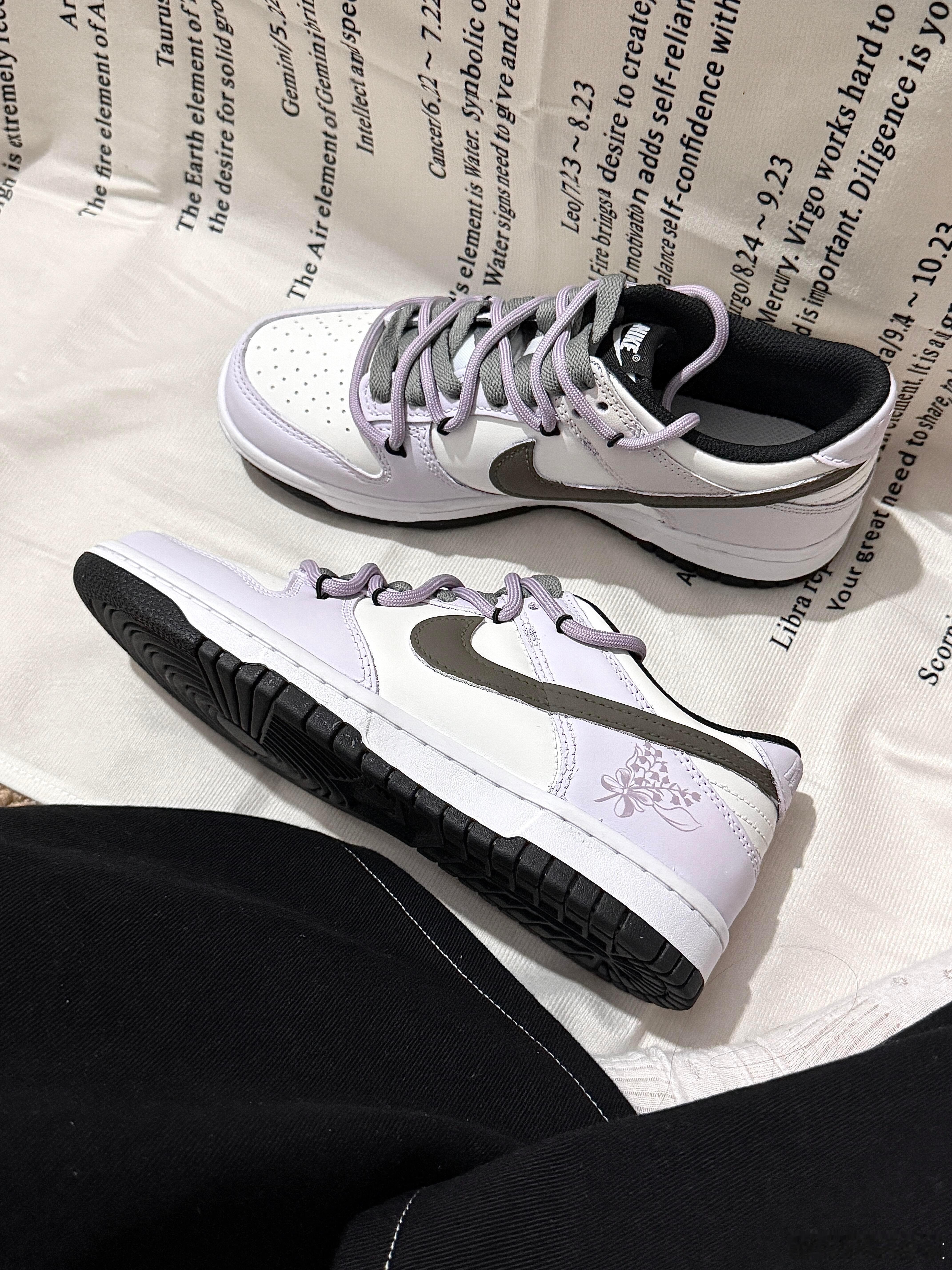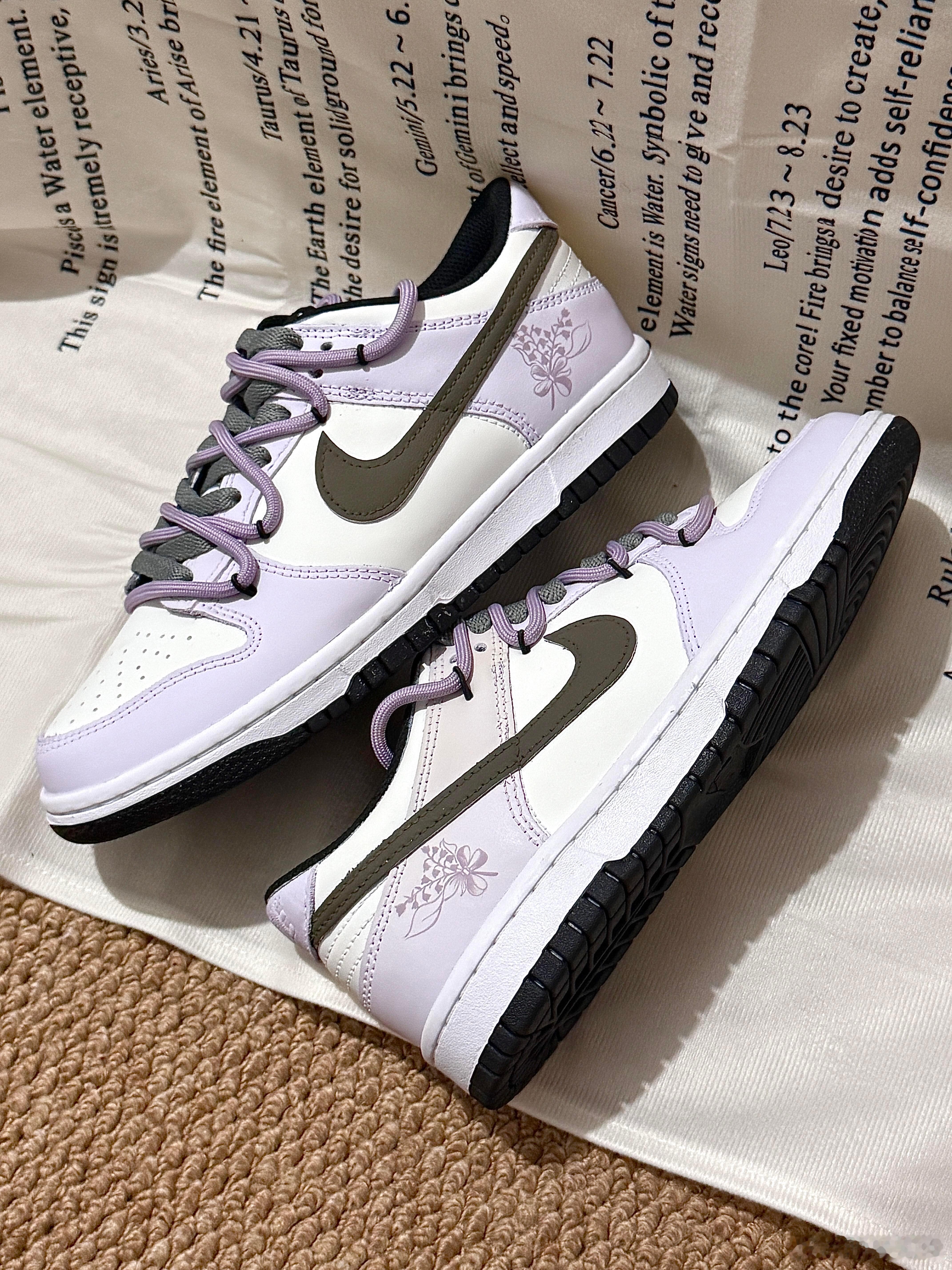 这双Nike Dunk Low以其独特的清新文艺气质脱颖而出。鞋身以纯净的白色为底,搭配了一抹低调雅致的橄榄绿色Swoosh勾标,瞬间注入了经典的学院风灵魂。而真正的点睛之笔在于鞋侧浅紫色的精致花卉图案,它以刺绣工艺呈现,为简约的鞋面增添了柔美浪漫的艺术气息,并与同色系的浅紫色鞋带完美呼应。