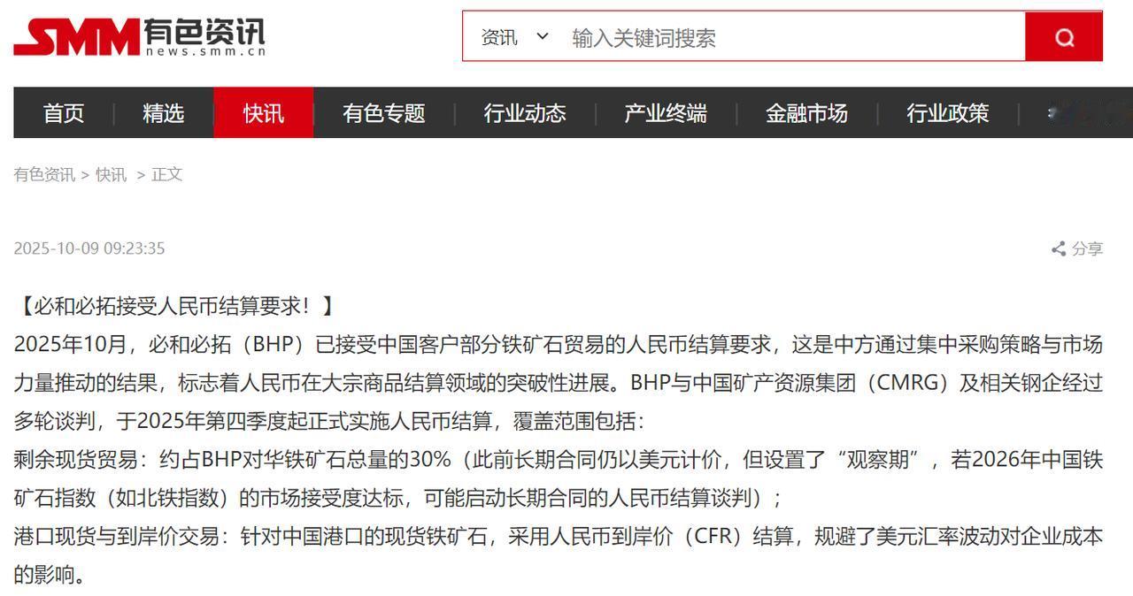 中国拿到铁矿石定价权!中方“卡脖子”一周后,澳铁矿巨头同意人民币结算 据多家外媒10月9日报道,日前,澳大利亚铁矿巨头“必和必拓”公司已经与中国矿产资源集团签署协议,同意自2025年第4季度起,以人民币进行铁矿石贸易结算。 其实这事儿早有苗头,不是咱们突然发难。2022 年成立的中国矿产资源集团就是关键,以前国内几千家钢厂各自为战,跟必和必拓这些巨头谈判时互相压价,人家根本不把咱们放眼里。 现在好了,这个央企把所有采购力量拧成一股绳,成了全球最大的铁矿买家,说话自然有分量。 就像咱们买菜,一个人买贵点忍了,要是全村人都找你买,你还敢随便涨价?这次暂停采购就是这么个道理,集中力量办大事,一下就把对方逼到了谈判桌前。 更解气的是,必和必拓还想耍小聪明,之前嘴上说可以人民币结算,却偷偷加了 0.8% 的汇率点差,这不就是换个法子涨价吗? 咱们根本不吃这一套。而且当时力拓比它识相多了,看到咱们的通知 48 小时就表态愿意用人民币结算,因为力拓 57.4% 的收入都来自中国,还跟咱们在几内亚的铁矿项目绑在一起,早就明白得罪不起。 必和必拓一开始硬扛,无非是背后美资股东盯着美元结算,但架不住中国市场太重要,最后还是得低头。 咱们能这么硬气,最根本的是早不是只能靠澳大利亚矿了。以前澳矿占咱们进口的 70%,现在降到了 58%,巴西淡水河谷把对华出口提到了 28%,俄罗斯今年前四个月就给咱们运了 120 万吨,几内亚那个超大铁矿年底就要投产,一年能出 6000 万吨,相当于澳矿对华出口的 15%。 有了这些备选,必和必拓不妥协,有的是别家愿意合作。你看西澳的港口,那几天矿石堆得跟山似的,货船排着队,海运费一周跌了 12%,它能不急吗? 这事儿最关键的是,咱们不光改了结算货币,更是把定价的话语权抢回来了。以前铁矿石贸易全用美元结算,美联储一加息降息,汇率波动一下就能吞掉咱们钢企一整年的利润。 而且价格全看人家的普氏指数,明明现货价跌到 80 美元以下,必和必拓非要按 109.5 美元的长协价卖,一年得让咱们多花 200 亿美元。 现在不一样了,咱们有了 “北铁指数”,跟大连商品交易所的期货价格绑在一起,大商所的交易量是新加坡市场的 23 倍,全球都得看咱们的价格脸色。现在新签的合同都开始参考咱们的期货价,这才是真真正正的定价权。 你看数据就知道这不是吹的,2023 年人民币结算占比才 5%,2025 年就冲到 25% 了,预计明年能超 40%。 淡水河谷都把结算中心搬到上海自贸区了,资金秒到账,必和必拓改用人民币后,资金周转快了 35%,一年还多赚 2.1 亿美元,这说明对它也有好处,不是咱们强逼的。 更不用说这还带动了其他商品,羊毛、大麦都开始用人民币结算,连咱们出口钢材的人民币结算占比都涨了 11 个百分点,形成了闭环。 想当年 2021 年铁矿石价格疯涨,咱们的钢企苦不堪言,就是因为没话语权。现在短短几年,从成立矿产集团整合力量,到拓展货源,再到建自己的期货市场,一步步把主动权拿了回来。 必和必拓妥协这事儿,就是最实在的证明,咱们终于不用在铁矿石上看别人脸色了。这可不是运气好,是国家早有布局,靠的是咱们全球最大买家的底气,靠的是把分散的力量拧成一股绳的智慧。 以后再买矿,怎么结算、按什么价,得咱们说了才算,这就是实实在在的定价权,想想都觉得提气!