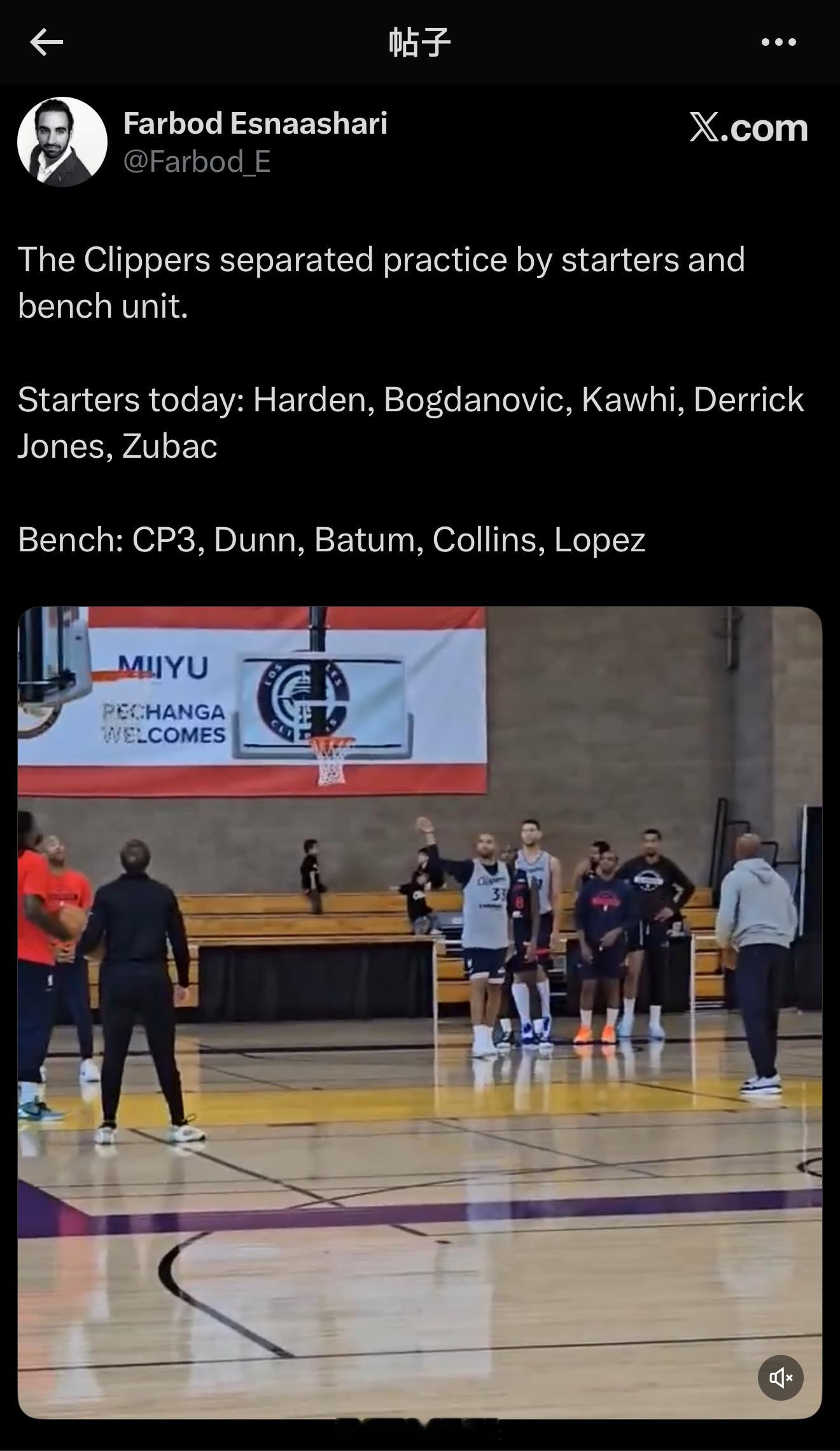 首发:哈登、博格丹、莱昂纳德、琼斯、祖巴茨