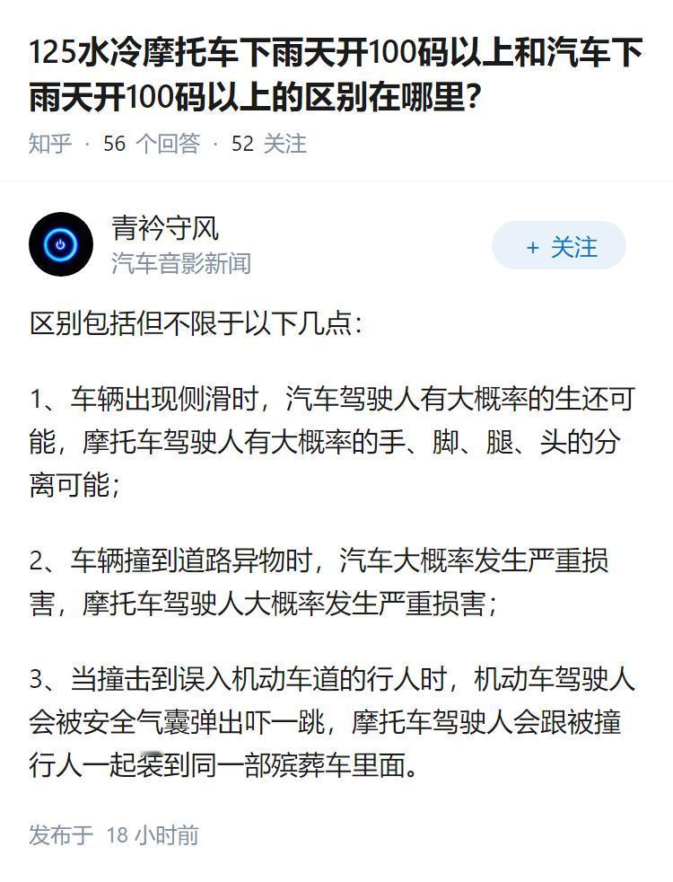 125水冷摩托车下雨天开100码以上和汽车下雨天开100码以上的区别在哪里?