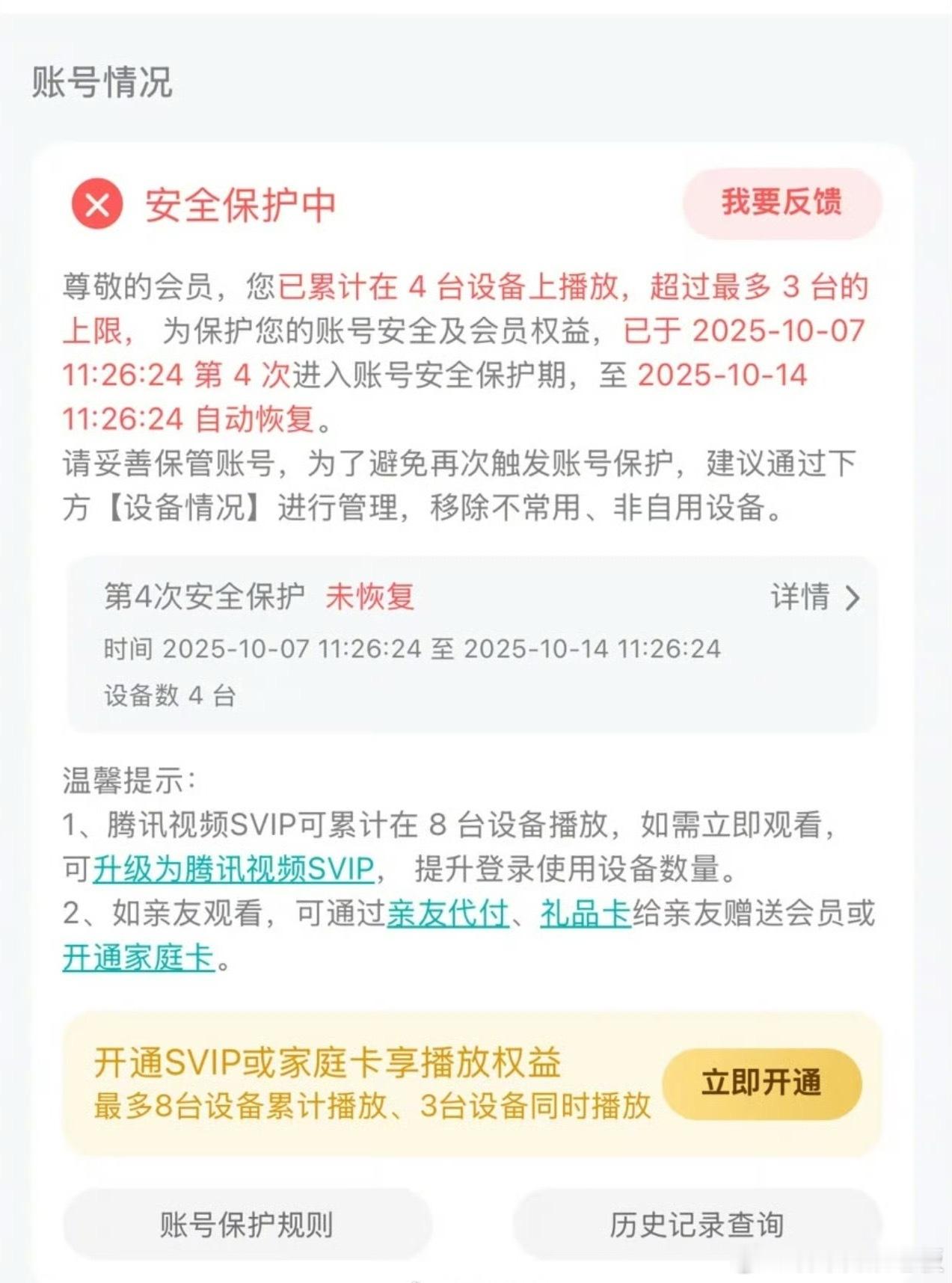 腾讯视频账号6次超限或面临封号充会员像进了“套娃陷阱”——手机端VIP刚续完,投屏到电视居然要单独买电视端会员,一家几口想用还得开“家庭共享”额外加钱。平台吃相越来越难看,把消费者当“提款机”薅,监管能不能管管这种乱象?