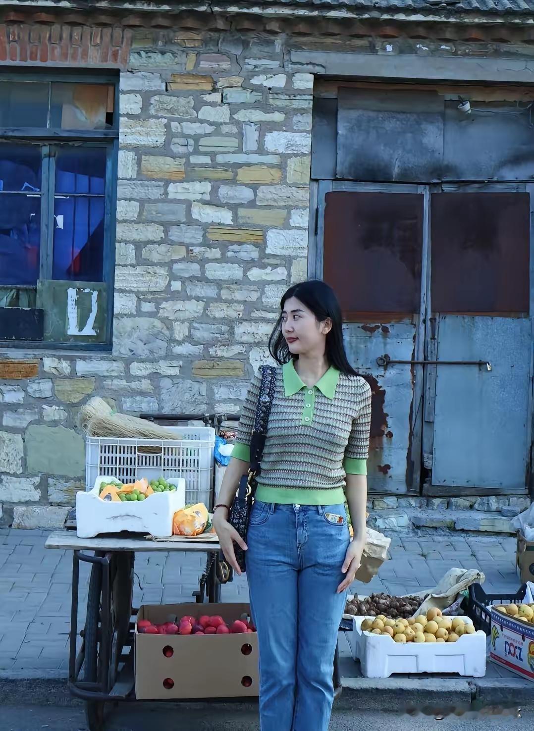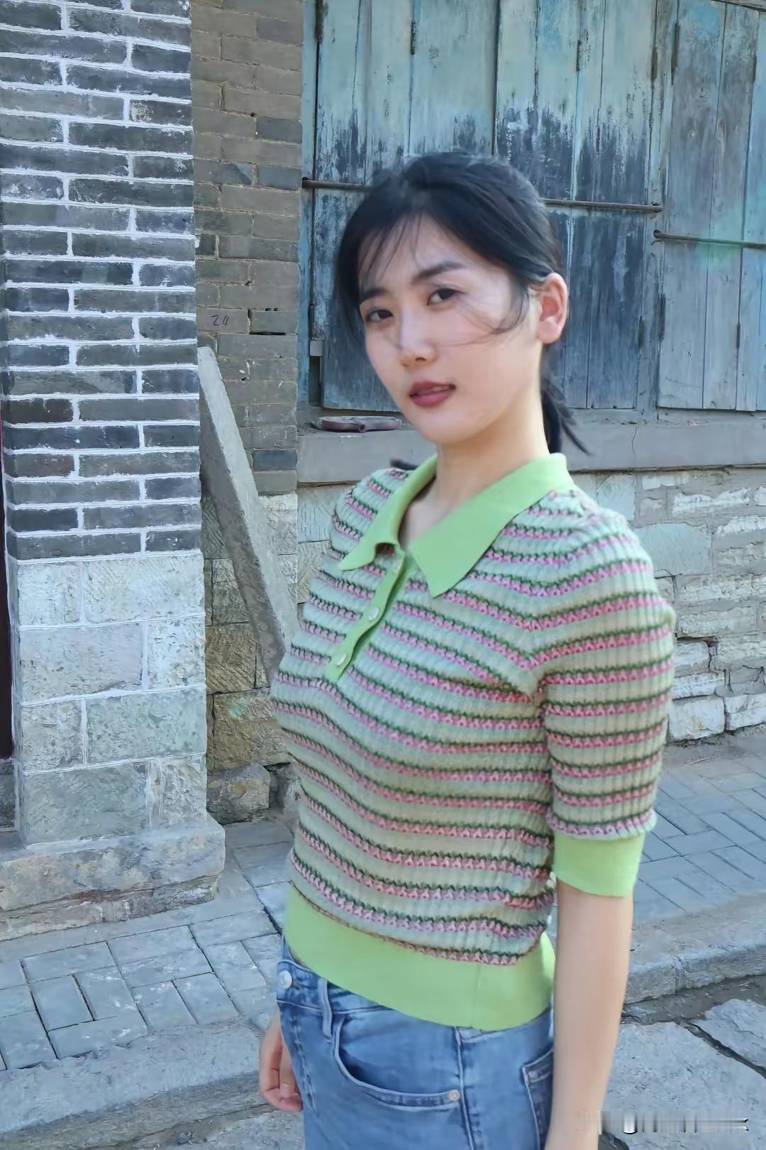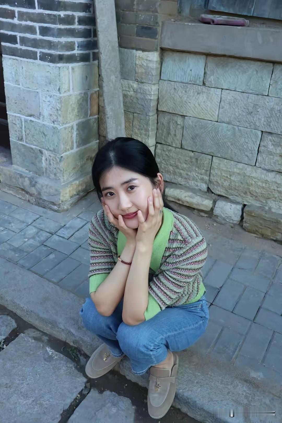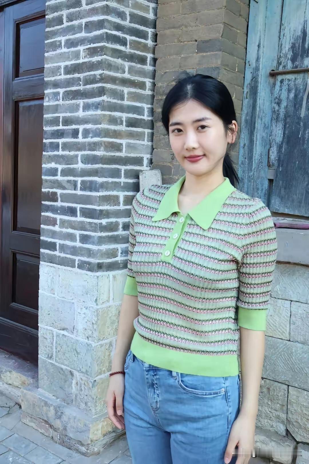复古砖墙前,绿衣少女微笑,怀旧与青春的碰撞。