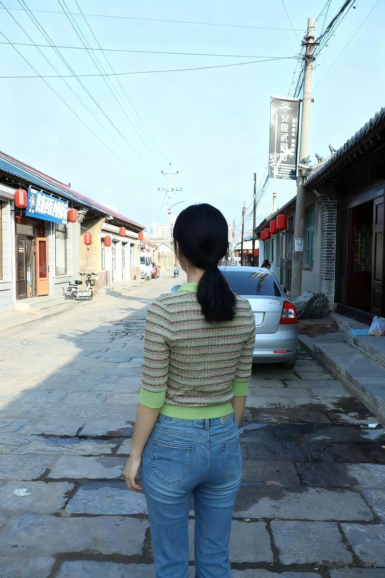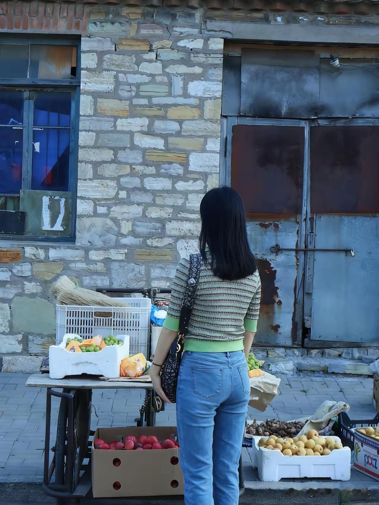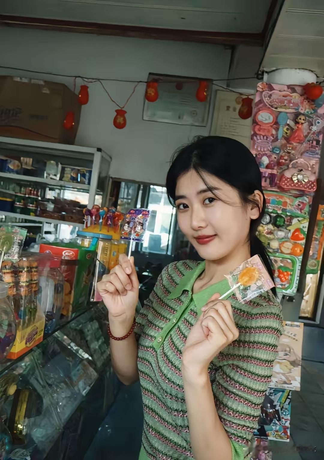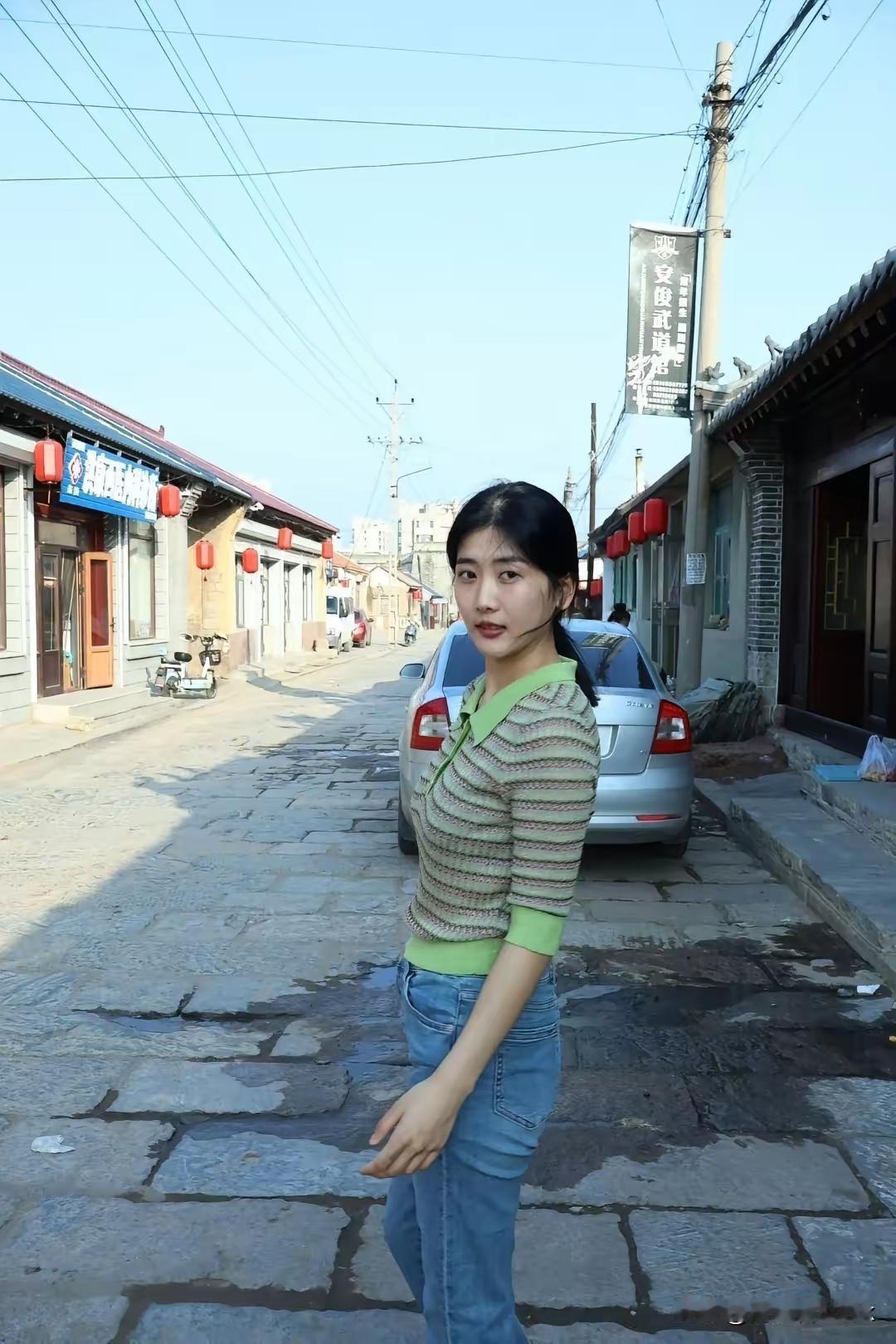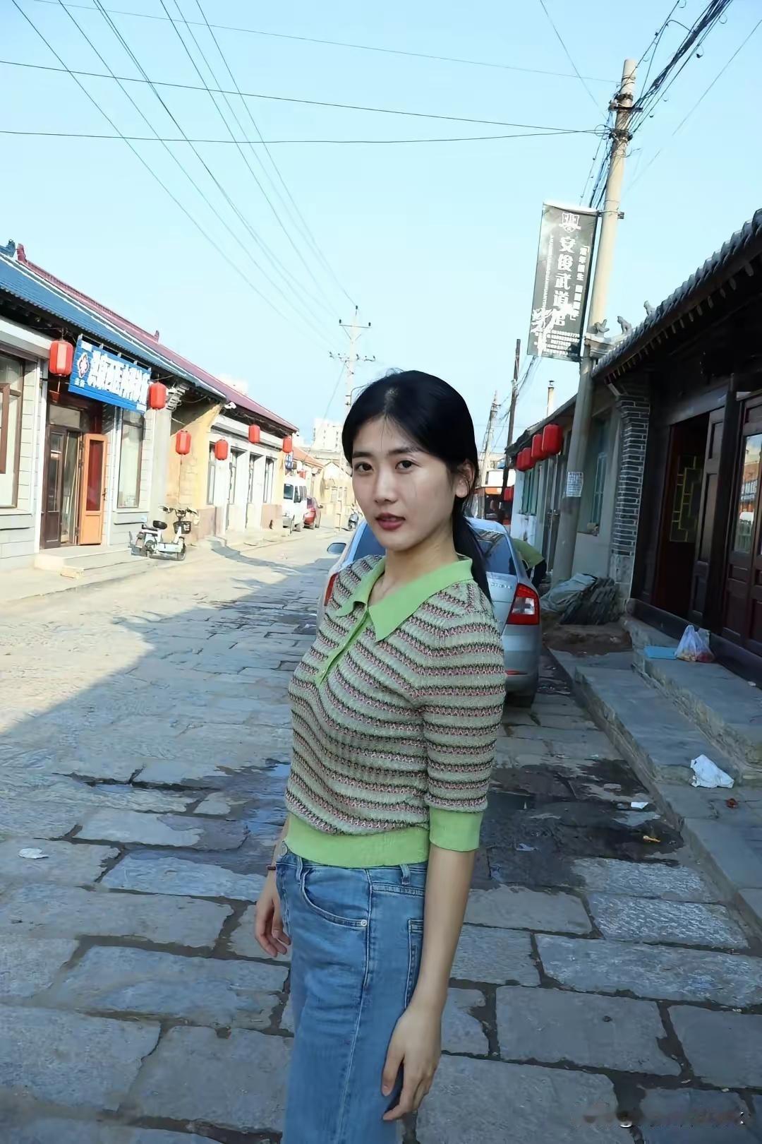 复古砖墙前,绿衣少女微笑,怀旧与青春的碰撞。