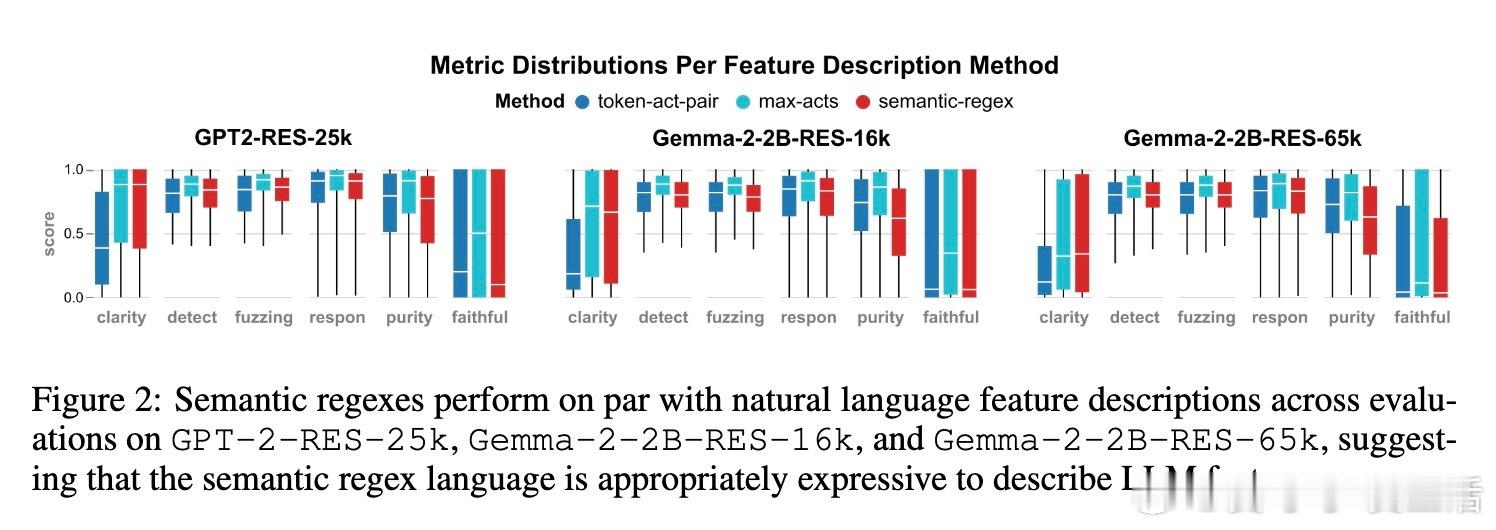 4/ 评测显示,语义regexes在准确度上不输自然语言描述,且显著更简洁、一致,有助于快速识别功能相似或冗余特征。