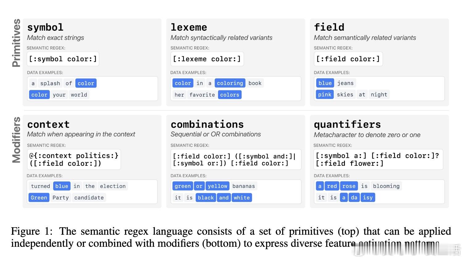 2/ 本文提出“语义正则表达式”(semantic regexes),用结构化语言精确描述LLM特征。它结合了原子成分——符号(symbol)、词素(lexeme)、语义域(field),及修饰符——上下文、组合和量化,形成表达力强且明确的语言。