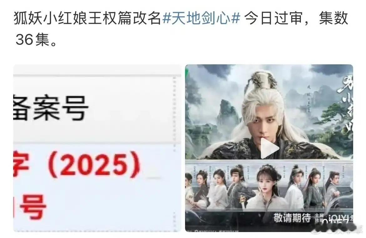 成毅新剧《狐妖小红娘王权篇》正式改名《天地剑心》,共36集。