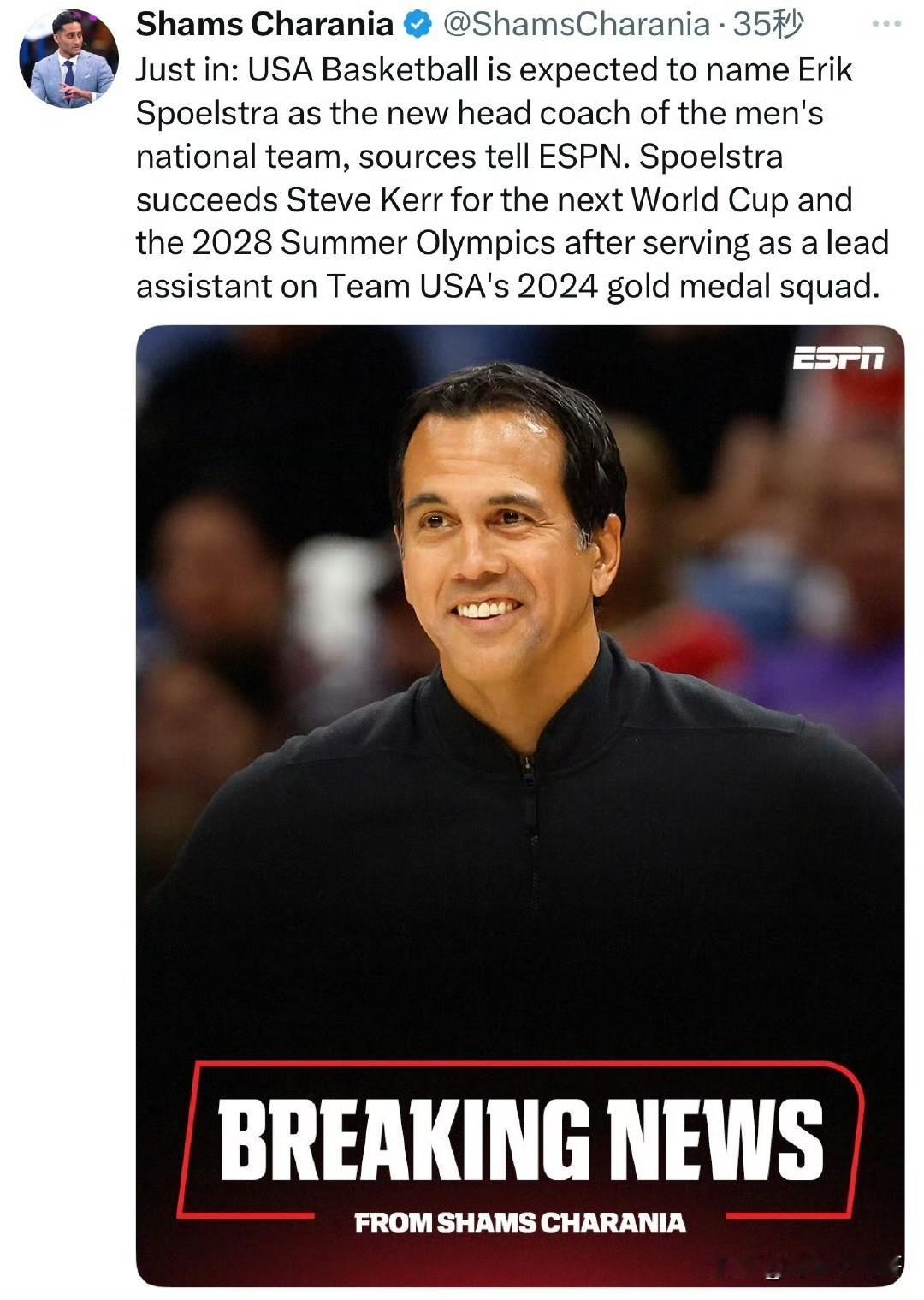 斯波尔斯特拉将成为美国男篮新任主教练!!! 根据记者Shams最新消息透露:热火队的斯波教练担任美国男篮的新主教练! 这其实没什么意外的,除了科尔外,斯波就是目前联盟中最好的主教练,或者说斯波教练是目前联盟中最好的主教练也不为过,毕竟科尔是看着勇士队的球星才在加盟中立足的。 之前美国国家队比赛时斯波教练也是球队的助理教练,接任科尔也是合情合理,预计从下一届世界杯和奥运会将会由斯波教练带领大家前往当地参加比赛。 斯波教练年纪轻轻的就能成为三巨头的主教练本身也说明了他的能力,当时大家一度以为这是一个靠着关系上位的菜鸟,没想到没有三巨头他依然是那个最出色的主教练。 恭喜斯波教练,实至名归!