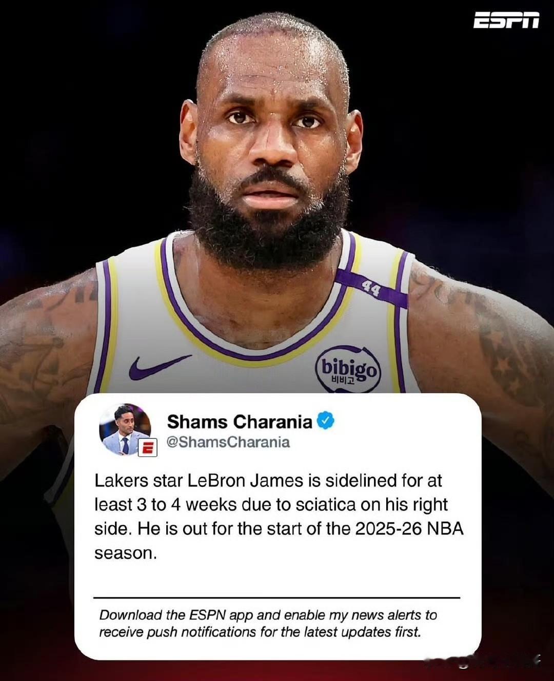 揭幕战不打了!!!詹姆斯因右侧坐骨神经痛,预计将缺阵3-4周! 根据记者Sha