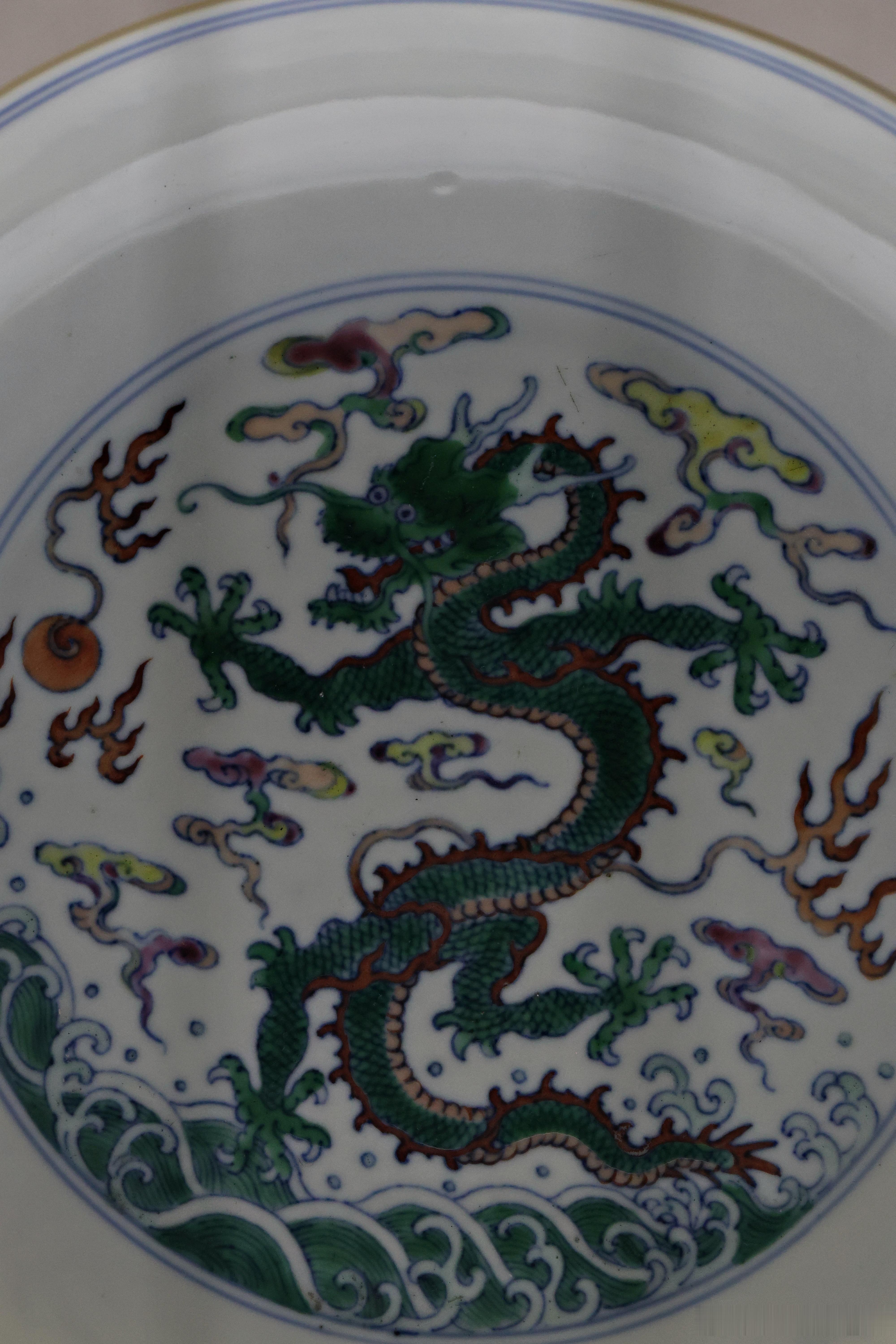 斗彩是中国古代陶瓷烧制工艺的珍品,创烧于明代成化年间,清代继续发展。此盘以白瓷为胎,盘心绘有矫健的龙纹,龙周围搭配祥云、火焰、海水等纹饰,色彩丰富,有红、绿、黄、紫等色,通过釉下青花与釉上彩相结合的斗彩工艺绘制而成,工艺精湛。龙纹在古代是皇权的象征,这类带有龙纹的瓷器,不仅体现了清代陶瓷装饰艺术的高超水准,也反映出当时的宫廷文化与审美取向,是研究清代陶瓷史和宫廷文化的重要实物资料。