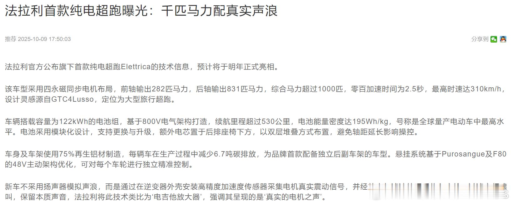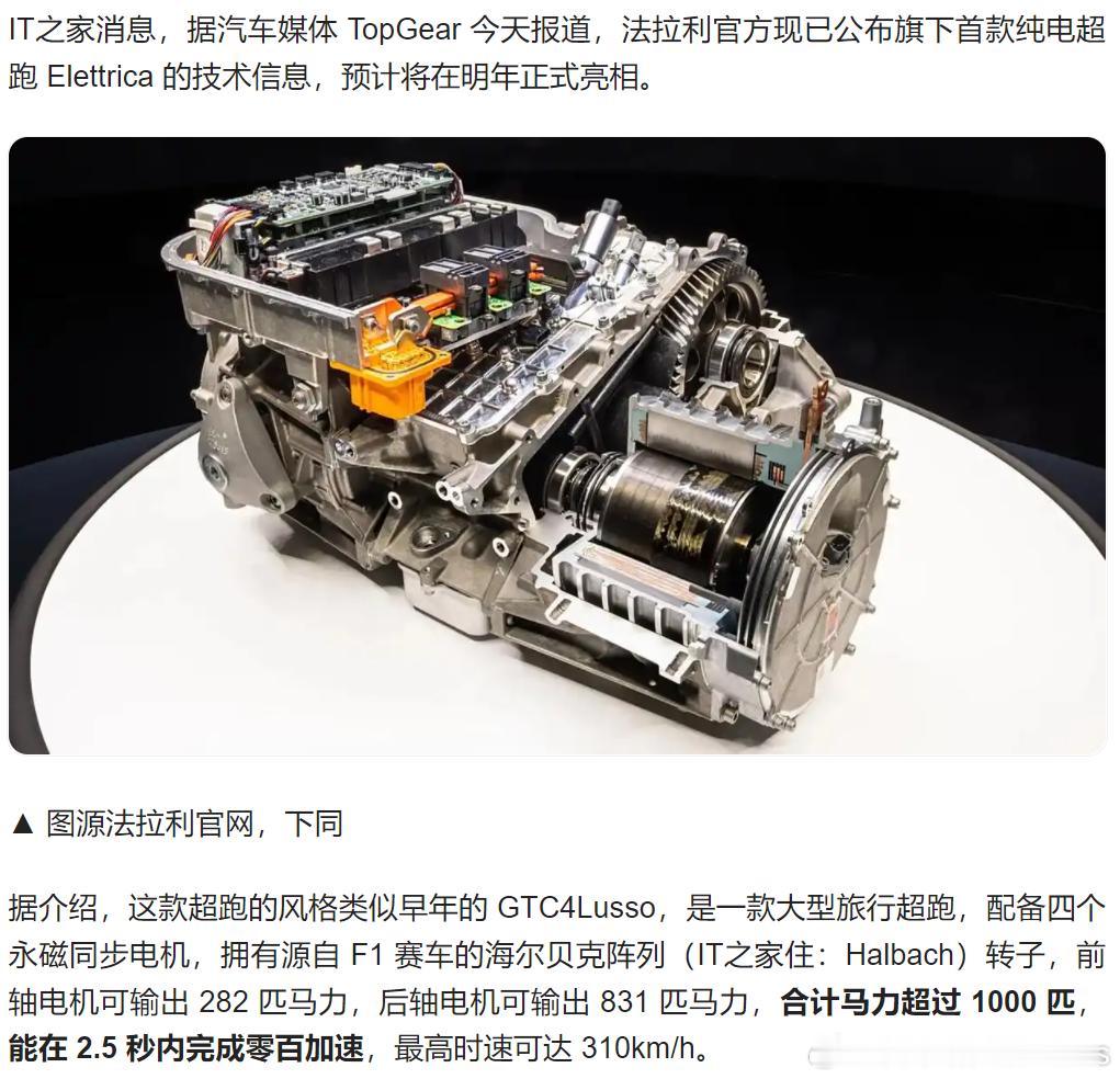 看了看法拉利刚公布的纯电超跑Elettrica,马力超过 1000 匹、 2.5 秒零百,最高时速310km/h,800V 平台。