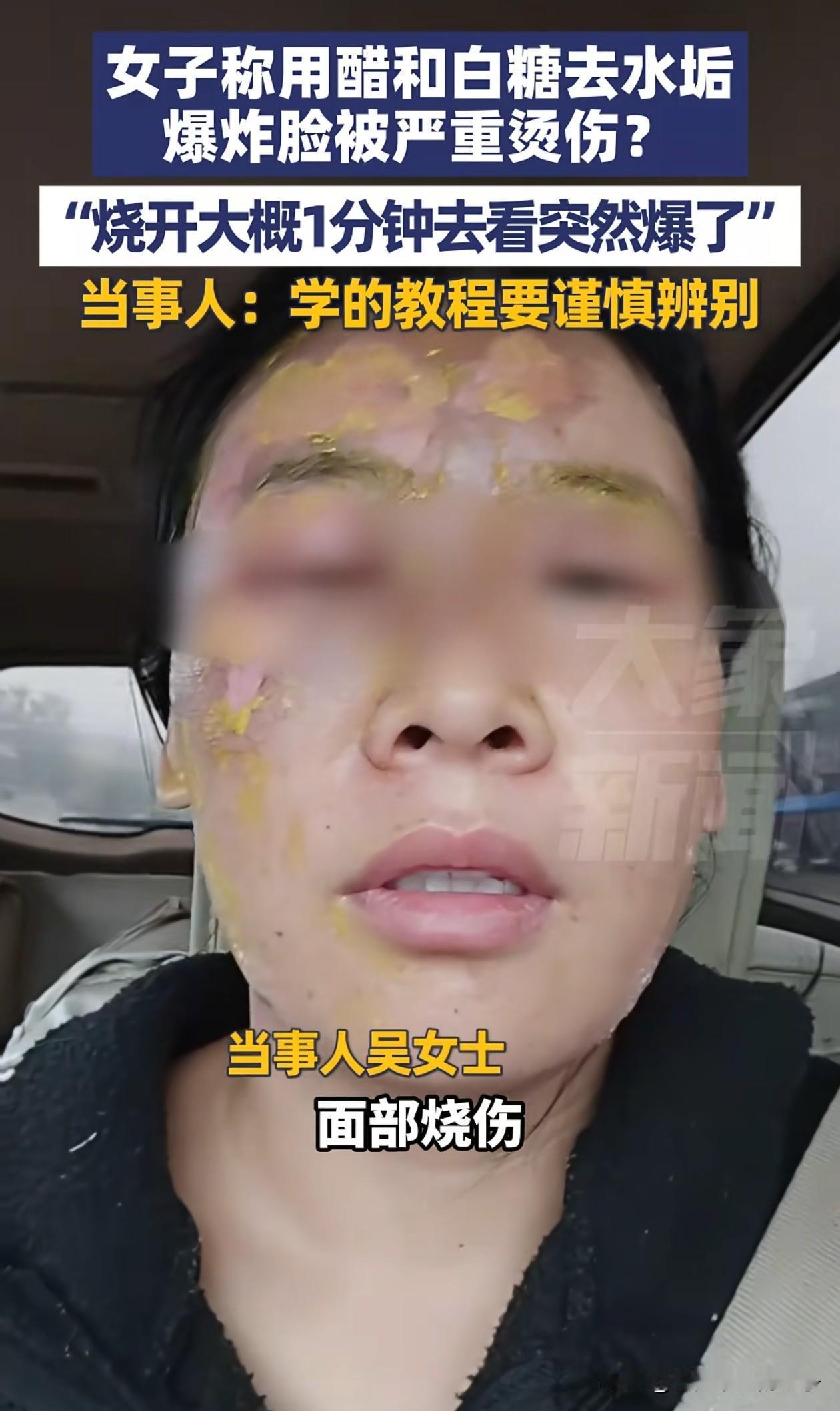 醋和白糖去水垢方法肯定没问题,因为我试过,而且试了两次,有效除水垢,家里两个烧水壶也没炸过,多半是女子只学了一半,自己操作不当导致的! 醋和白糖又不会发生反应,就算什么都不加,开水只要摇过一样会崩开,正确的做法应该开着盖子,或者直接放一晚上不用管,第二天再去看就行了,谁让她隔一分钟就去打开的。 建议那些动手能力差的,就不要随便去相信网上的小妙招,一顿瞎操作,最后医药费多的都花了,还不如老实买点去水垢的,又便宜又好用!