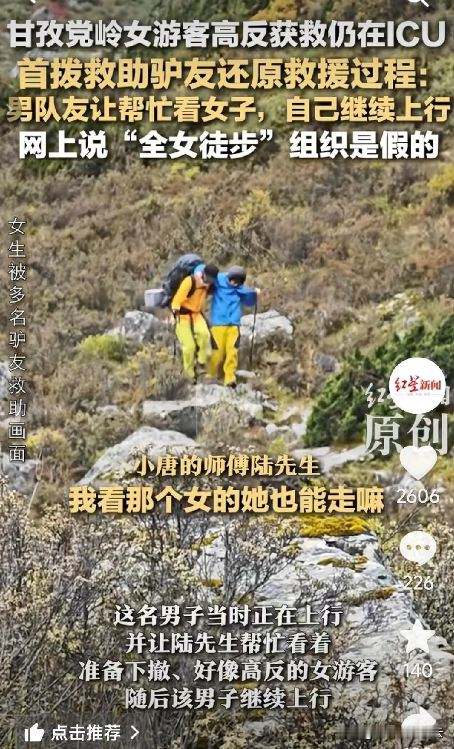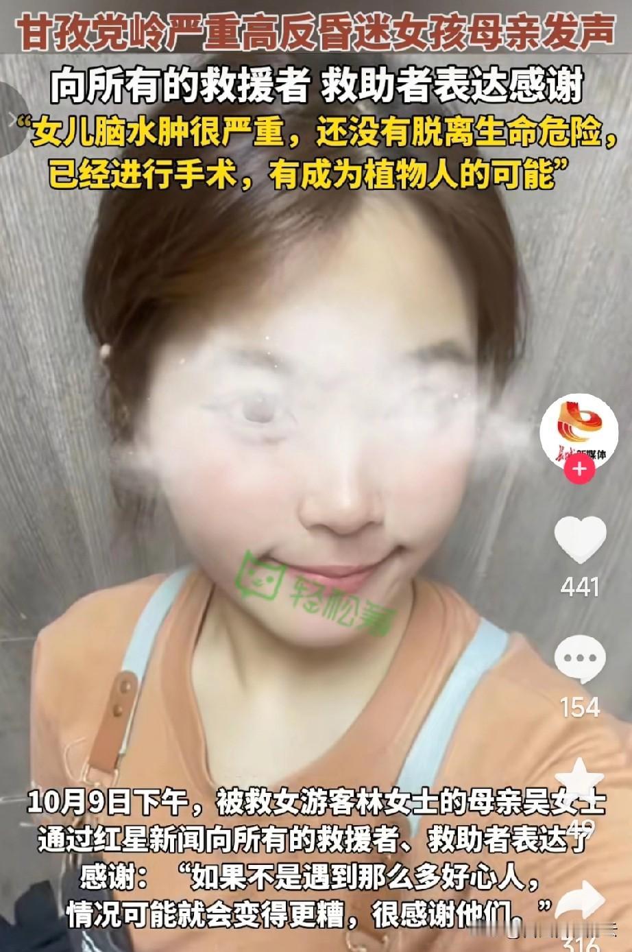 在甘孜党岭高反被救助的女孩还有后续,女孩被一群好心人救下来后送到了医院。本以为是个暖心的故事,年轻的女孩终于捡回一条命,没想到这件事还没完。 近日,女孩的父母在网上求助,说是女孩还没脱离生命危险,一直在重症监护室。她已经做了一次手术,医生说可能还要做第二次。女孩的病历上写着高原性水肿,缺氧缺血性脑病,也引发了脑疝,即使醒过来也可能成为植物人。 女孩父母说他们是农村家庭,女儿 高昂的医药费已经承担不起了,无奈之下在网上发起了求助。女孩今年才20岁,刚从卫校毕业,本来想送自己一个毕业礼物的,没想弄成这样。 不过也辟谣了,女孩不是在网上找的全女团队。第一个救她的男子说,当时看到一个男驴友在女孩旁边看着她,看到男子过来后让他帮忙看着,那个男驴友继续上行了。 女孩还这么年轻,希望她能挺过来。但是很多网友也不同情她,有网友说徒步去的装备都好几万,衣服也很贵。不是我们普通家庭承受的,玩的时候想不到我,筹钱了想到我们了? 对于这件事,你怎么看呢?