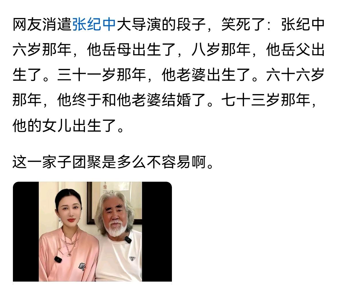 网友消遣张纪中大导演的段子,笑死了:张纪中六岁那年,他岳母出生了,八岁那年,他岳
