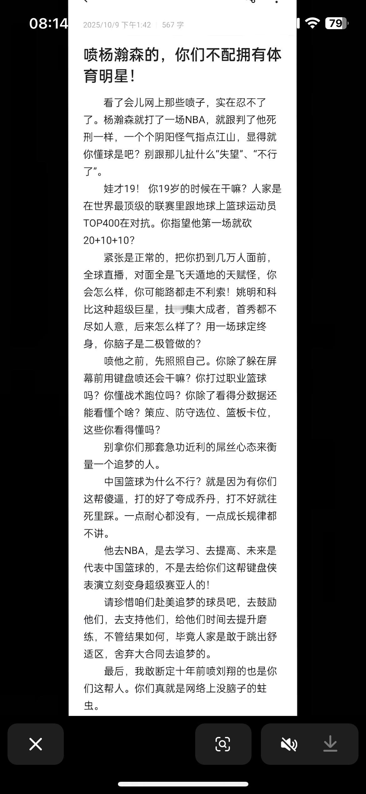 喷杨瀚森的,你们不配拥有体育明星! 一博主看到很多人开喷杨瀚森,很是生气,心里窝火,写下这篇文章。 其实呢,劝他根本不用放在心上,根本没必要,试问不管是中国还是国外,有哪一个明星没有被喷过,哪一个明星没有黑粉,别说是杨瀚森了,哪怕是乔丹,科比,詹姆斯,库里,梅西,马拉多纳等等,再牛逼的体育明星,都有大批黑粉,这都是很正常,从事体育运动,不光是有很强的身体天赋和过硬的技术,还必须有强大的心里承受能力,杨瀚森这才刚开始呢,一个漫长的赛季不知道要承受多少喷子,不光是国内的,国外的喷子同样很多! 这些人,不管你打的好还是不好,他们都能找到喷点,如果小杨打得不好,就像这第一场一样,他们喷的可欢实了,说什么速度慢,身体素质差,他根本打不了NBA,最多一年就回CBA了……如果小杨打得好,他们就会说,是对手太弱,对手防守太差等等,反正,他们也不是和杨瀚森有仇,他们就是看你不顺眼而已,其实不用在意,这就是人性的恶,很多人难以承认别人的优秀,只好在网络上想通过恶言恶语打败那个很优秀的人,从而来证明自己的观点是正确的,作为运动员你要是太在意网上喷子的言论,那你就上当了! 杨瀚森,继续加油,你会做得更好!