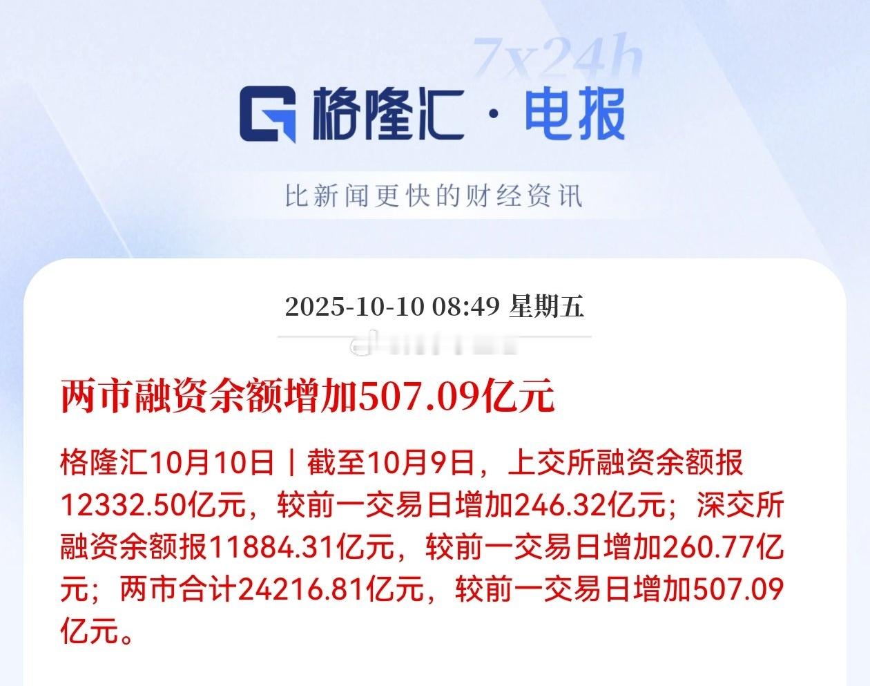 两市融资余额增加507.09亿元。