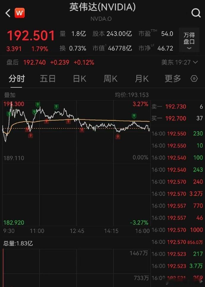 10月9日,英伟达股价创盘中与收盘历史新高,上涨至 193 美元,盘中涨幅超 2.5%,市值逼近 4.7 万亿美元,成交额 352.53 亿美元。