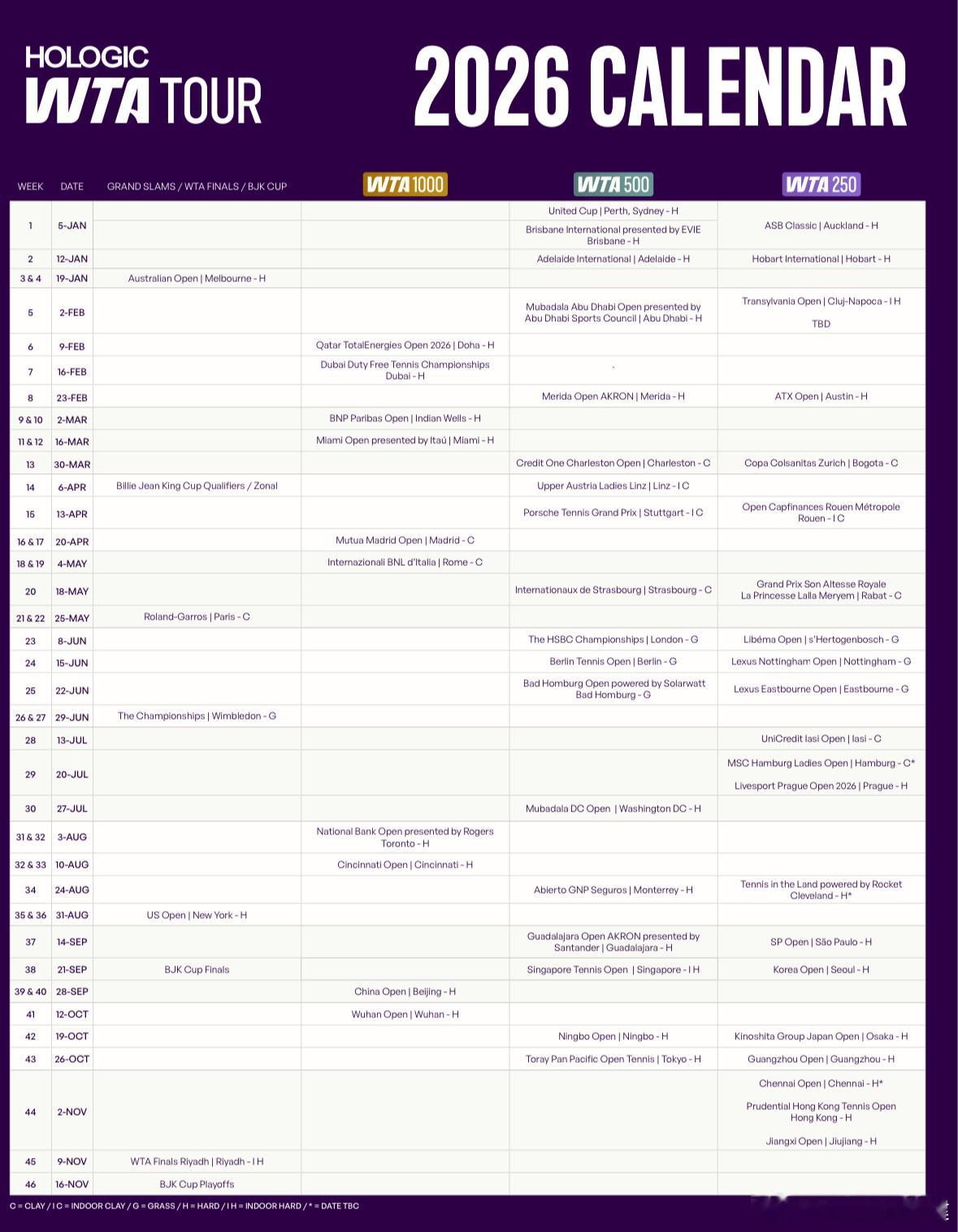 2026年WTA赛程公布:中国的赛事没有变化。今年由斯瓦泰克夺冠的首尔500赛降
