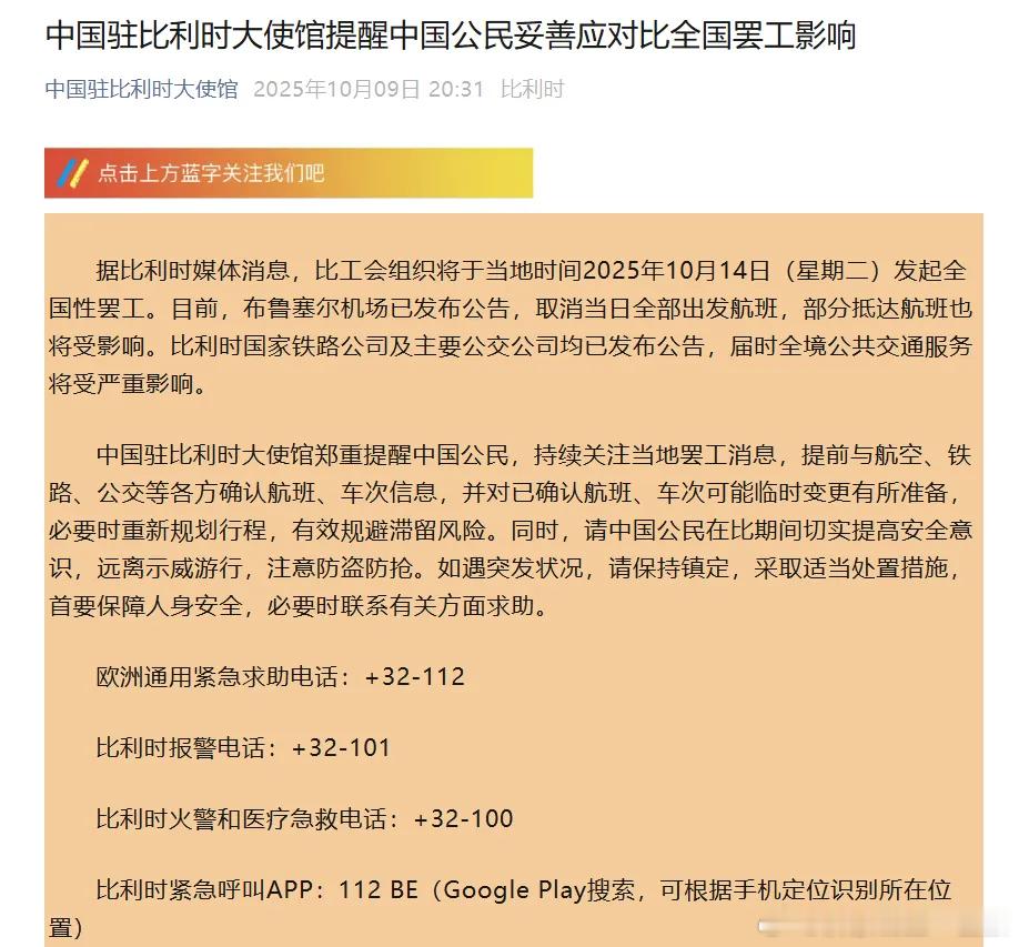 10月9日,中国驻比利时大使馆提醒中国公民妥善应对比全国罢工影响。