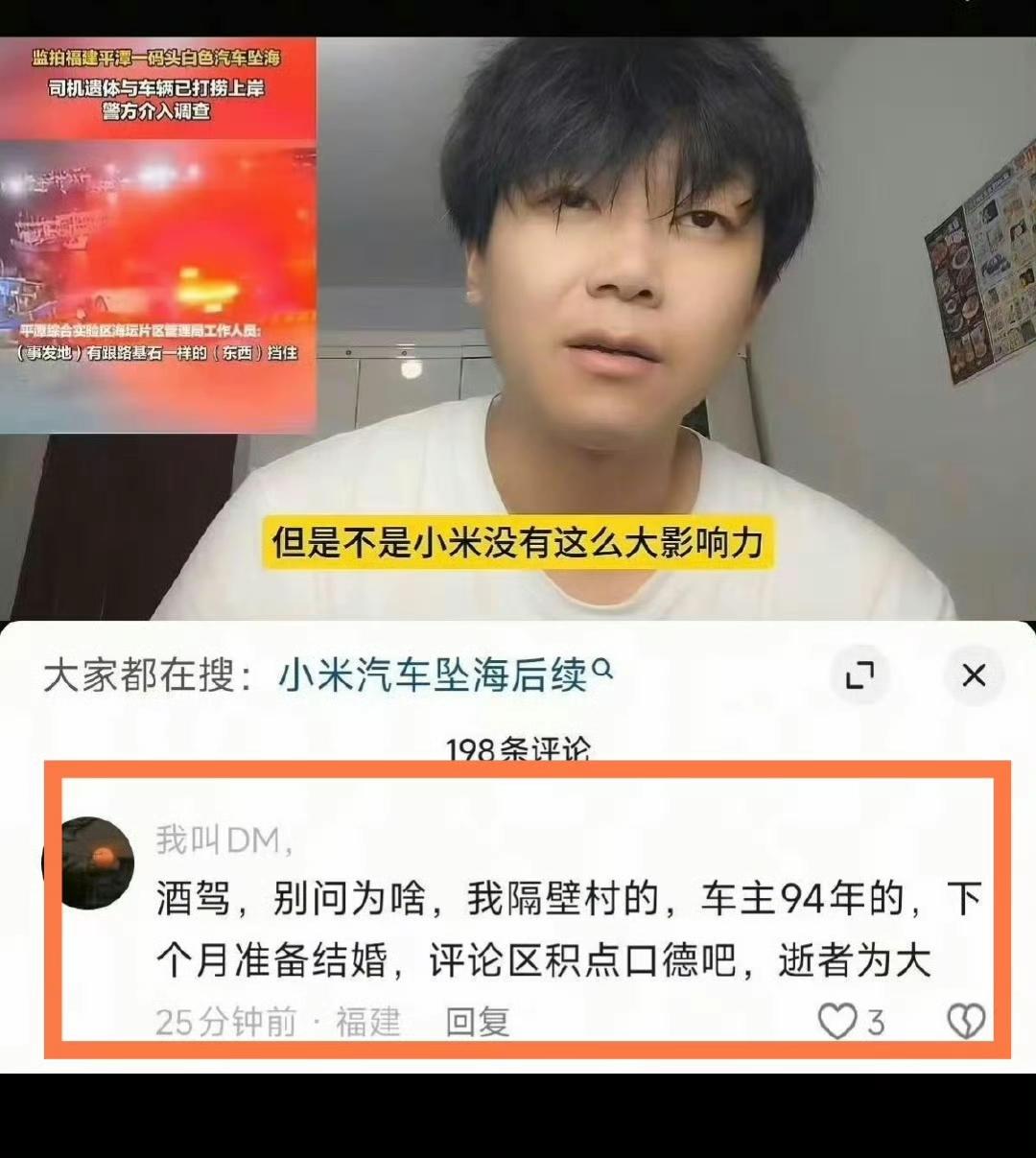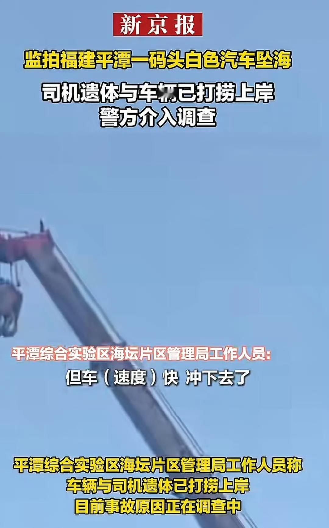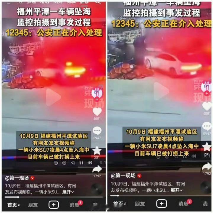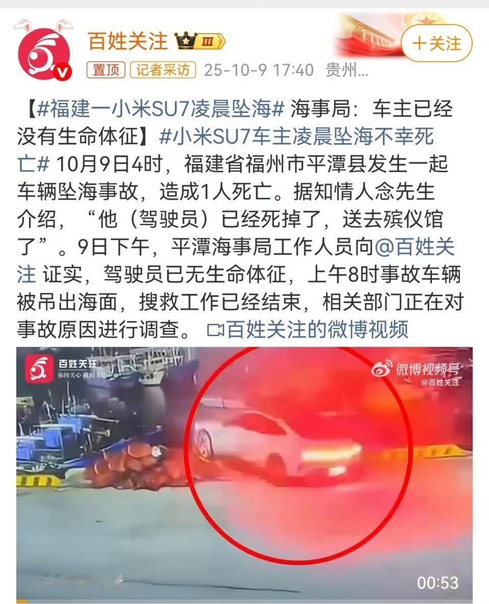 出大事了。 10月9号凌晨4点,福建福州平潭,一辆小米SU7掉进海里了。 据知情人念先生说,开车的人没了,已经送殡仪馆了。 当天下午,平潭海事局的人跟媒体证实了,驾驶员确实没生命体征了。 上午8点,出事那辆车被从海里吊了上来。搜救工作已经结束。 现在相关部门正在调查,到底是怎么回事出意外的。 是开车的人没有注意?还是车出了啥问题?都不好说。 但是一条人命没了,这事挺让人揪心的。 不管是啥原因,希望能早点查清楚。给逝者家人一个交代,也让大家心里有个数。 你们觉得可能是啥情况?su7小米汽车 小米汽车出事故 su7小米事故 小米车车祸 小米宁波事故 小米汽车坠落 小米su7自驾 小米速7爆炸 信息来源:百姓关注