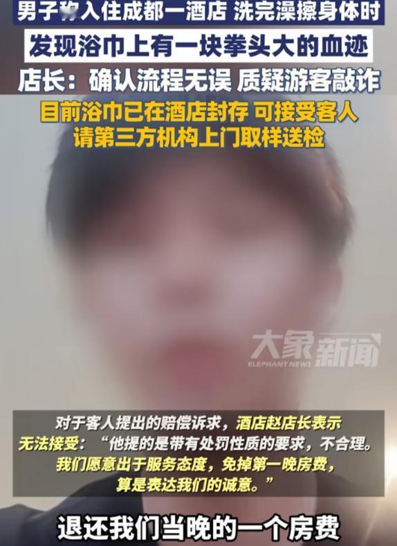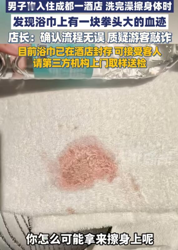 四川成都,男子入住某酒店,洗完澡后,用浴巾擦拭身体,突然发现浴巾上有拳头大的血迹