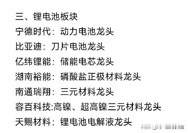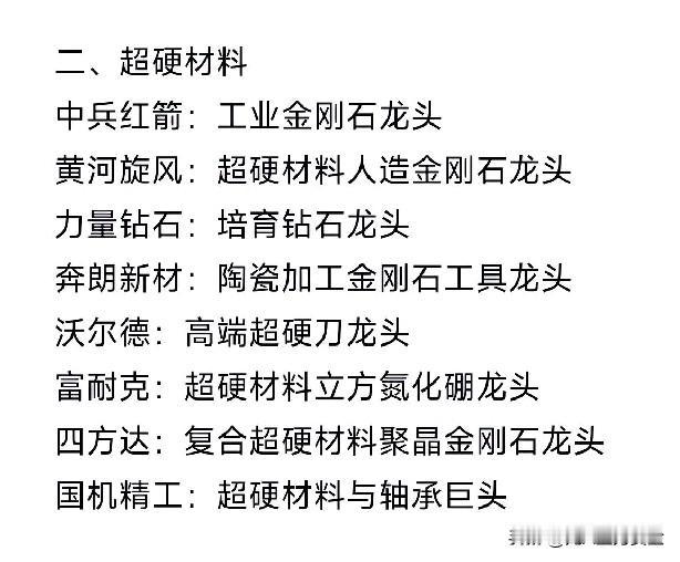 稀土永磁、超硬材料及锂电池相关细分领域的龙头企业如下: 一、稀土永磁板块 北方稀土:上游稀土资源龙头 中国稀土:中重稀士龙头 金力永磁:新能源领域磁材龙头 中科三环:高端钕铁硼龙头 宁波韵升:消费电子磁材龙头 正海磁材:高性能磁体龙头 英洛华:钐钴永磁龙头 大地熊:热压钕铁硼龙头 银河磁体:粘结钕铁硼龙头 二、超硬材料 中兵红箭:工业金刚石龙头 黄河旋风:超硬材料人造金刚石龙头 力量钻石:培育钻石龙头 奔朗新材:陶瓷加工金刚石工具龙头 沃尔德:高端超硬刀龙头 富耐克:超硬材料立方氮化硼龙头 四方达:复合超硬材料聚晶金刚石龙头 国机精工:超硬材料与轴承巨头 三、锂电池板块 宁德时代:动力电池龙头 比亚迪:刀片电池龙头 亿纬锂能:储能电芯龙头 湖南裕能:磷酸盐正极材料龙头 南通瑞翔:三元材料龙头 容百科技:高镍、超高镍三元材料龙头 天赐材料:锂电池电解液龙头