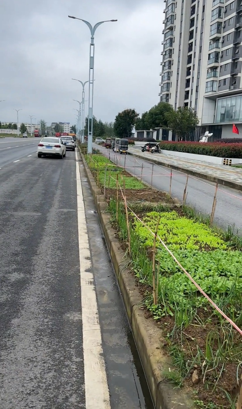 一生要种菜的中国人,公路绿化带都利用上了,其实种路边不好,我怕别人吐口水在菜上面。