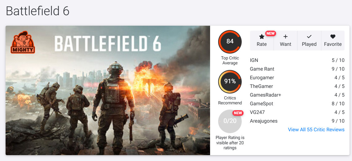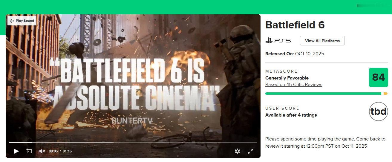 《战地风云6》媒体评分解禁,Metacritic媒体均分84分,收录45家媒体,Opencritic媒体均分84分,收录55家媒体。游戏将于10月10日晚11点登陆Steam/Epic/PS5/Xbox Series X|S。