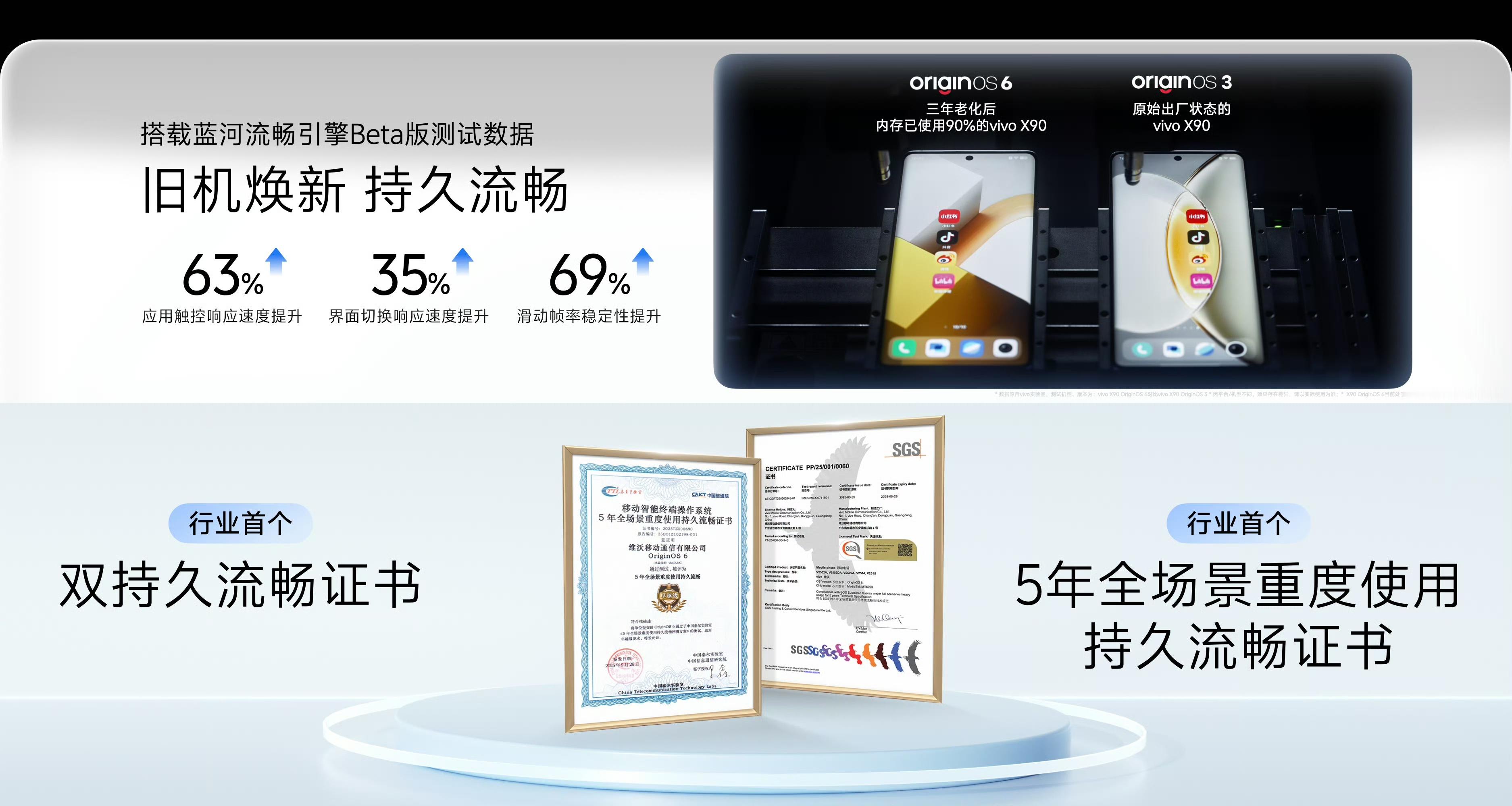 流畅不止于动效——蓝河流畅引擎让你刷短视频11小时不闪退,应用启动和响应速度也比行业最快还要快。更厉害的是,系统获得了5年持久流畅双认证,用三年后依然像新机一样顺滑!