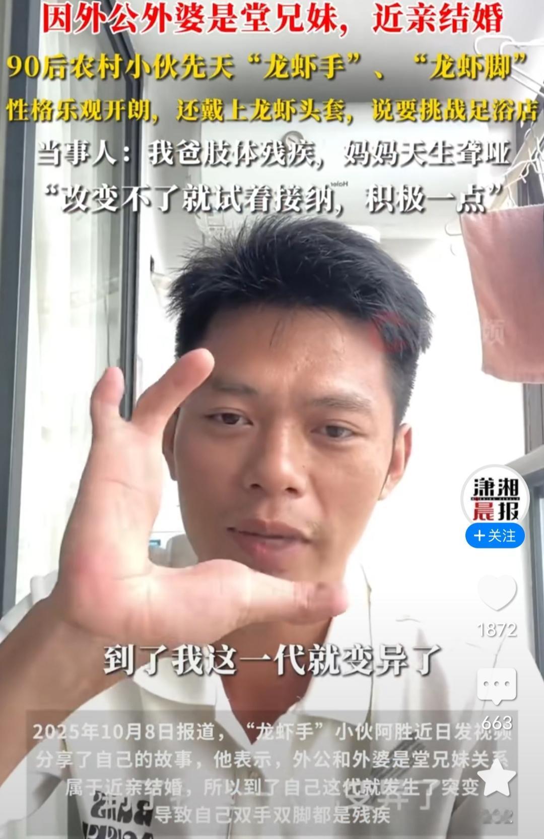 90后农村小伙子天生“龙虾手”“龙虾脚”,性格乐观开朗,还戴上龙虾手套,说要挑战足浴店。 看到相关媒体账号的报道,这个有着龙虾手,龙虾脚的小伙子就阿胜,仿佛是他自己在自己账号发出来的,视频里我们可以看到,他的双手,双脚长的真的就像龙虾钳子一样,他说因为他的外公外婆是堂兄妹近亲结婚,到了他这里就变异了,他妈妈天生聋哑,他爸也肢体残疾,所以他也是残疾的,但是好在他的心态很健康,积极乐观地面对生活,说改变不了就接纳,还说要挑战足浴店,这样身残志坚的年轻人,值得点赞! 我以为这个世界大家都应该懂得了近亲不能结婚这个事实,可看到评论区原来还有那么多的人还在选择近亲结婚,是知识的匮乏还是教育的缺失?还是什么其他的现实原因?不要害人害己,居然看到有个网友评论说,爱的事情不好说,这违背伦理的事情就该在潜意识里杜绝,少拿爱来说事,爱是让两个人两家人,甚至后代越来越好,而不是贪图眼前一时欢愉而冒摧毁两个家庭和后代命运的险。 希望像阿胜这样的孩子都能有个好的生活,有勇敢面对一切困难的勇气,加油!