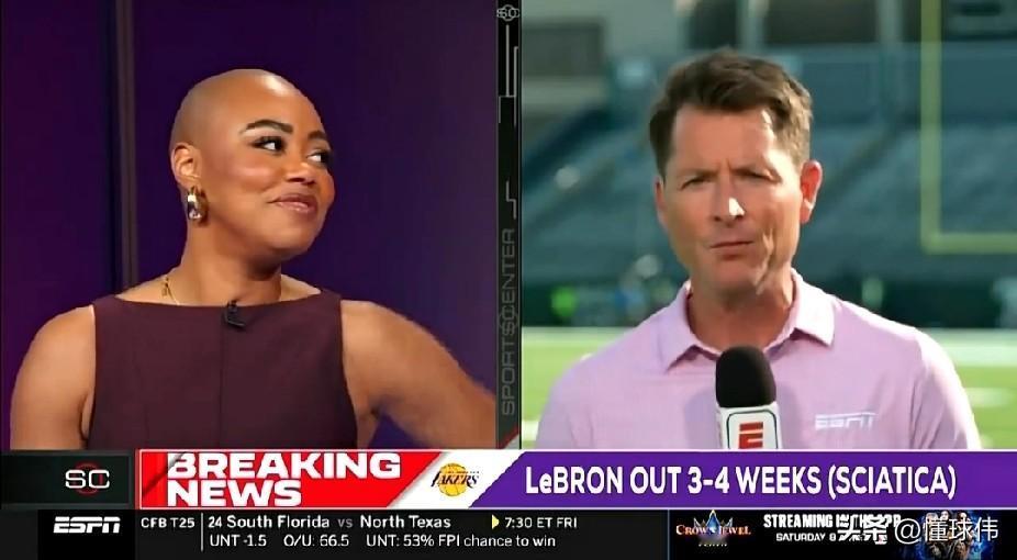 詹姆斯因为坐骨神经痛伤病,将会缺席差不多一个月的时间! ESPN主持人调侃詹姆