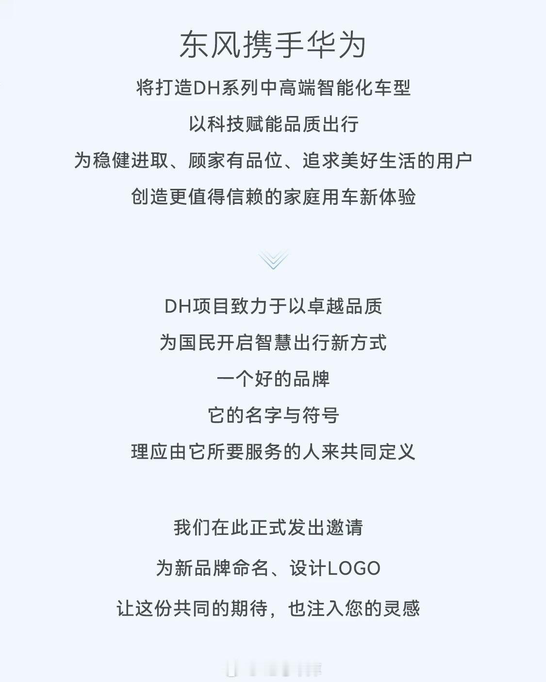 东风宣布要跟华为一起打造一个 DH 系列中高端智能化车型,发起了征名活动。