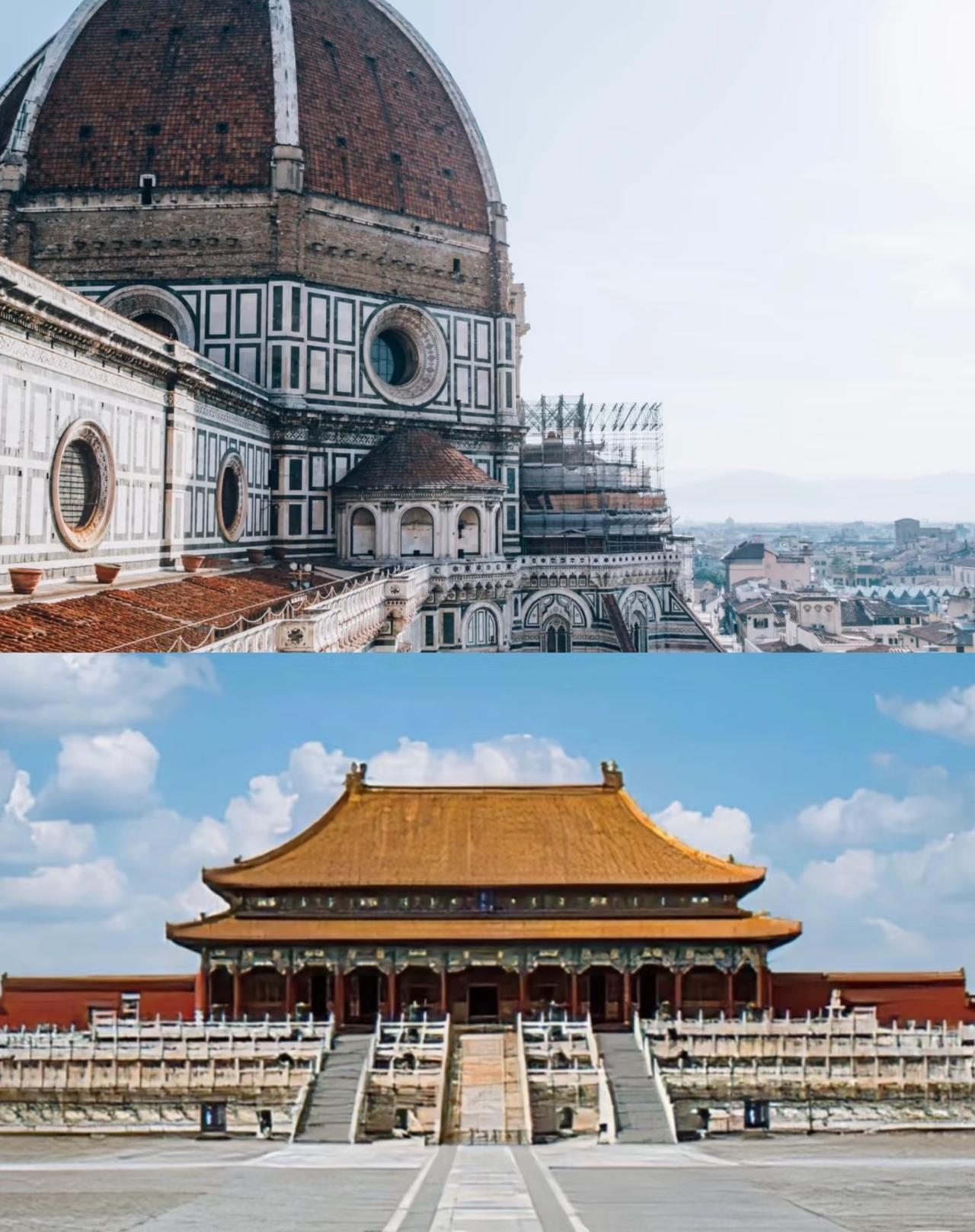 难以想象 他们竟然是在同一时期建成的,哪个建筑更难呢? 你能想到这两个建筑是在差不多同一时期建成的吗 其实早在紫禁城筹备伊始的前一百多年——13世纪末 佛罗伦萨百花大教堂就开始兴建了 因为穹顶的方案难度而迟迟没有完工 直到紫禁城开始备工备料的第三年 1408年 伯鲁乃列斯基才解决了这个问题 然后又花了16年才完。