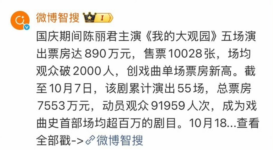陈丽君《我的大观园》 国庆中秋节又创造记录了,五场演出票房达890万元,售票10028张,场均观众破2000人,成为戏曲史首部场均超百万剧目