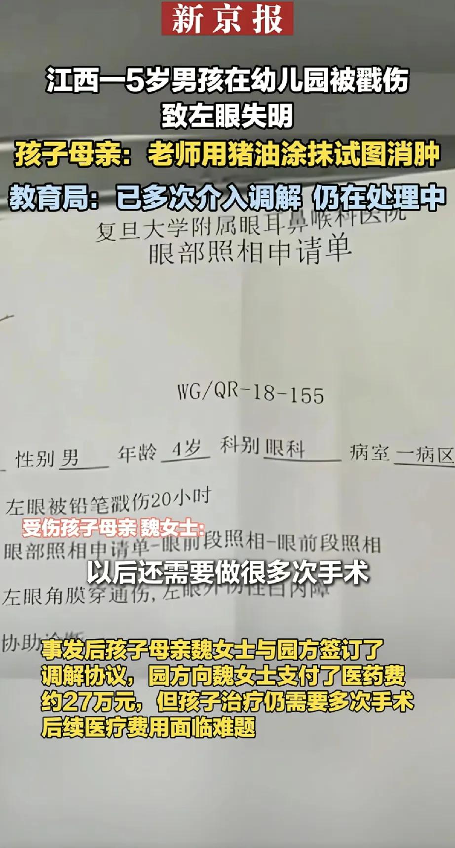 真不敢信! 江西瑞昌一个5岁孩子在幼儿园被戳伤眼睛, 老师不送医不通知家长, 反倒用猪油涂眼“消肿”, 最后直接导致孩子左眼失明! 更气人的是, 还是对方家长放学时主动告知, 老师全程像没事人一样, 这哪是教书育人的老师, 简直是拿孩子健康当儿戏! 幼儿园收了钱就该负起责任, 孩子在眼皮底下受伤, 连最基本的急救常识都没有, 还自作主张用偏方, 这不仅是失职,更是对生命的漠视! 27万赔偿看似不少, 可孩子一辈子的光明和未来, 多少钱能换得回来? 监管漏洞、师资失职, 这样的幼儿园真能让家长放心把孩子交过去吗? 你觉得该怎么杜绝这类悲剧?儿童眼睛伤残