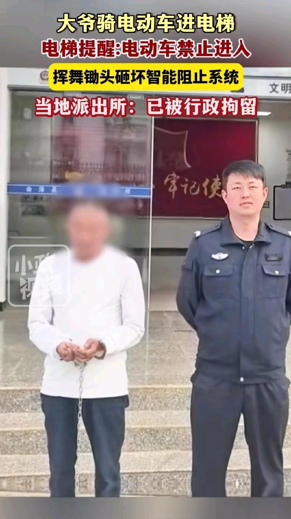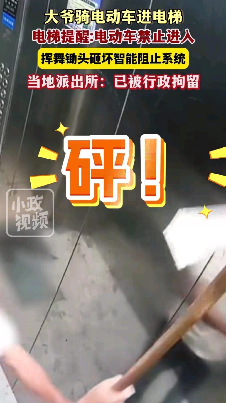 云南大爷真勇,骑电动车进电梯,被电梯智能设备检测到,设备出言阻止,电梯门不能关闭,大爷一生气,挥起锄头砸坏了智能阻止系统。事后,小区物业报警,大爷毫无悬念被民警带走。 大爷就为了把电动车骑上楼充电,省那么四五块充电费,砸坏了只能阻止系统,这个系统至少得赔1000块,把十年的充电费都搭进去了。 人教人不会,事教人一次就会。相信大爷一定不会再把电动车骑进电梯了。 那么,为什么电动车或者电动车电池不能带入电梯呢? 因为在电梯里的震动、急加速、急减速,会使电池隔膜破解,使得电池正负极直接接触,瞬间短路,产生大量电流,释放大量热量,从而引起火灾。所以,一定不能把电动车以及电池带进电梯,后悔可来不及。