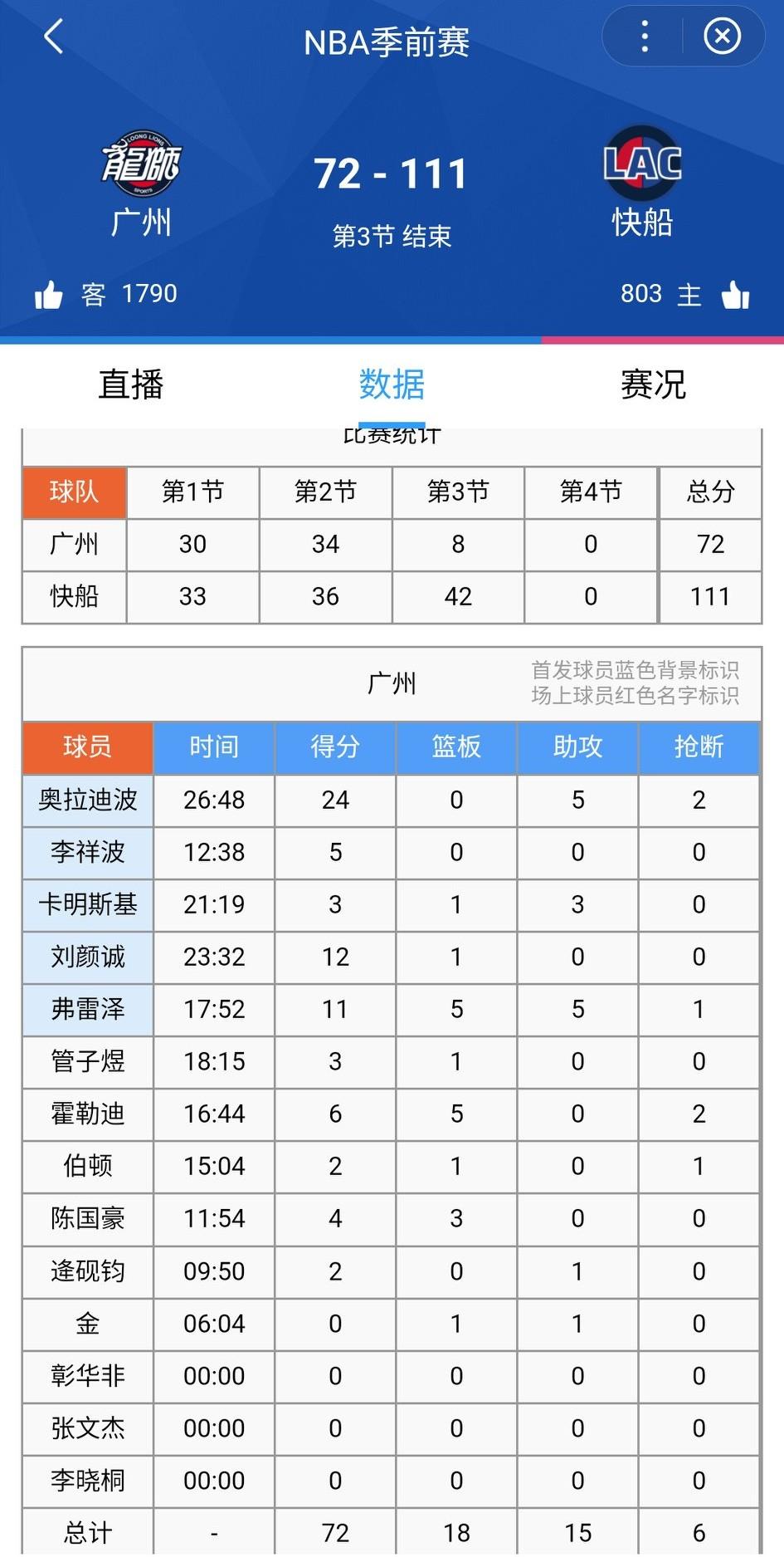CBA球队跟NBA球队的差距就在第三节!NBA季前赛快船对阵广州龙狮,上半场陪你玩玩,第三节开始展现真正的实力。 第三节竟然打出42-8的悬殊比分,龙狮队不也有几个来自NBA的球员吗?奥迪、霍勒迪、卡明斯基,他们该拼着命打啊。 第四节估计快船会放水,在别人的地盘,得给点面子。