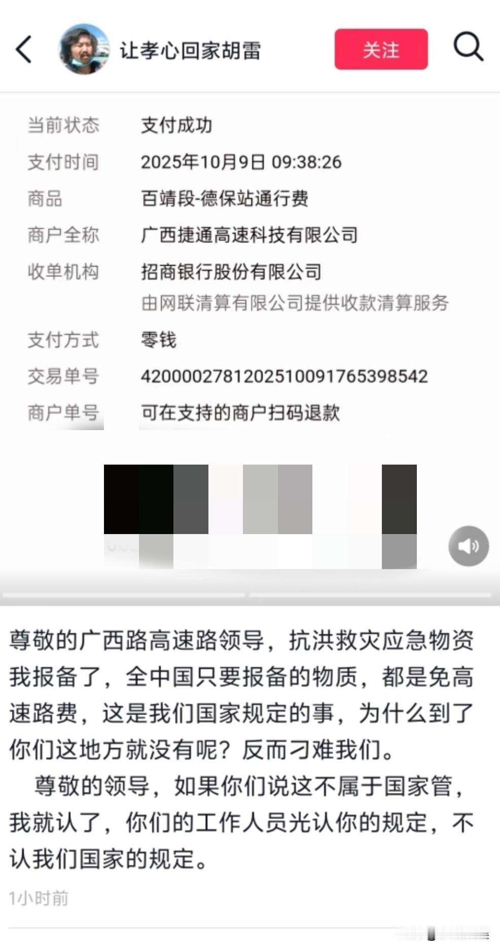 胡雷向百色捐赠物资,被收取1180元过路费吗? 官方的最新回应来了,原来事情并不是大家想的那样! 前几天残疾人胡雷向广西百色捐赠了救灾物资,没想到却在过高速口收费时被收取1180元的过路费。 而这件事情也是让他很是意外,明明自己已经报备了这是救灾物资,是不应该收取费用的,为何到了自己这里就要收费,此事也是迅速在网上发酵。 而官方也是注意到了这件事情,并且做出了回应,原来胡雷当时走的是ETC通道,属于自动扣费。而官方也是承诺会马上做出退费处理。原来这一切都是个误会,好在现在误会解开了,也不至于寒了善良之人的心。