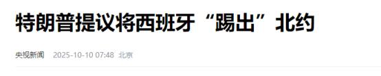特朗普突然放话:要把西班牙从北约阵营里“踢出去”! 他的提议看似针对单一国家的施压,实则揭开北约内部深层矛盾,军费争议背后,是霸权诉求与同盟现实的碰撞,以及军事集团的结构性裂痕。 北约峰会举行之时,各成员国踊跃签署协议,按照协定,未来成员国须大幅增加国防开支,将其提升至全新标准,该标准较先前水平有了显著跃升。 即便北约秘书长提出拆分方案,将非传统防务支出纳入统计,目标可行性仍受质疑,从实际情况看,北约整体国防开支有限,欧洲盟国平均投入更低。 西班牙当前投入已超欧洲均值,其首相的拒绝并非个例,德国防长称军费提升超出财政承受力,意大利、比利时等国也表达反对。 部分国家为筹军费削减民生开支,其国防大臣表示,当前军费足以履行北约义务,背后是对财政的考量,能源危机下,增军费会挤压医疗、养老等民生资金。 西班牙在北约中始终保持相对独立,可美国自身却难掩矛盾,他们军费未达要求标准,甚至低于部分欧洲盟国,更具争议的是,他们不用遵守标准,却要求盟友 无条件履约”。 美国对北约军费的诉求本就带功利性,如今加码要求,是想转嫁防务成本的霸权行径,更深层危机在于,若军费目标落地,将加剧全球安全失衡。 信息来源:央视新闻 2025年10月10日