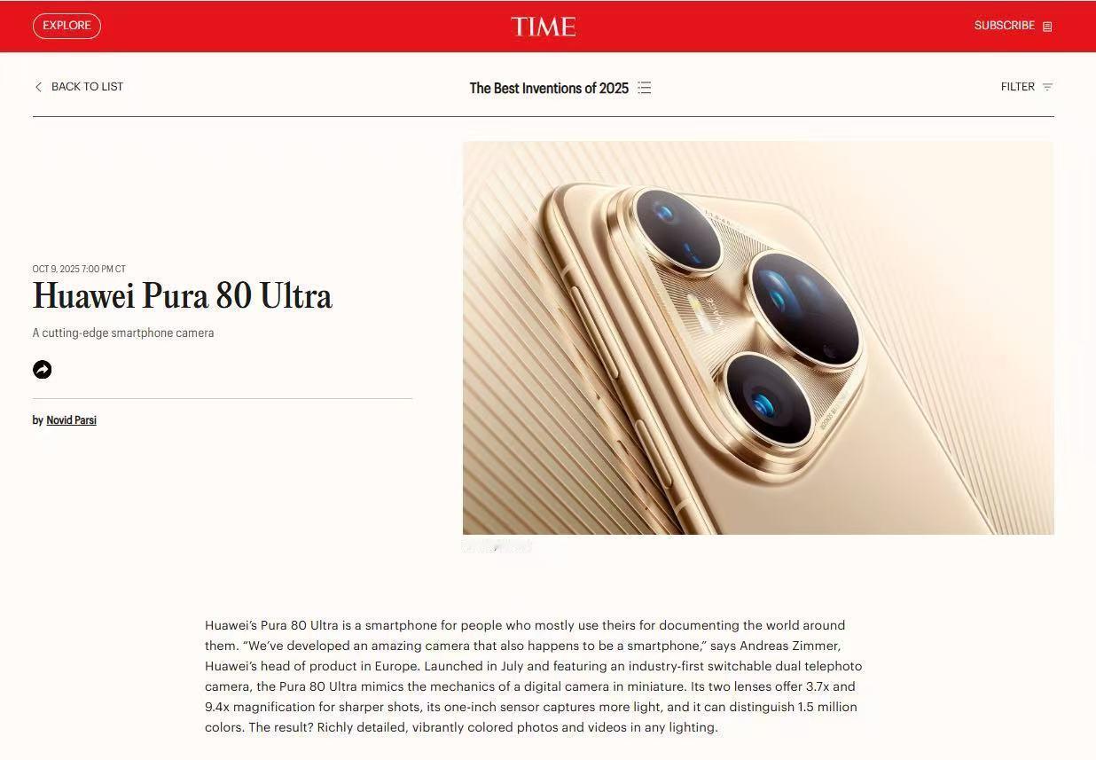 华为苹果同登时代周刊华为Pura 80 Ultra、华为Watch GT 6 Pro入选《时代周刊》2025 年度最佳发明榜。《时代》评价称,华为Pura 80 Ultra 将“专业相机理念融入手机”,重新定义了移动摄影边界。华为Watch GT 6 Pro凭借卓越的运动监测、健康管理与续航创新入选。华为两款产品上榜年度300大发明