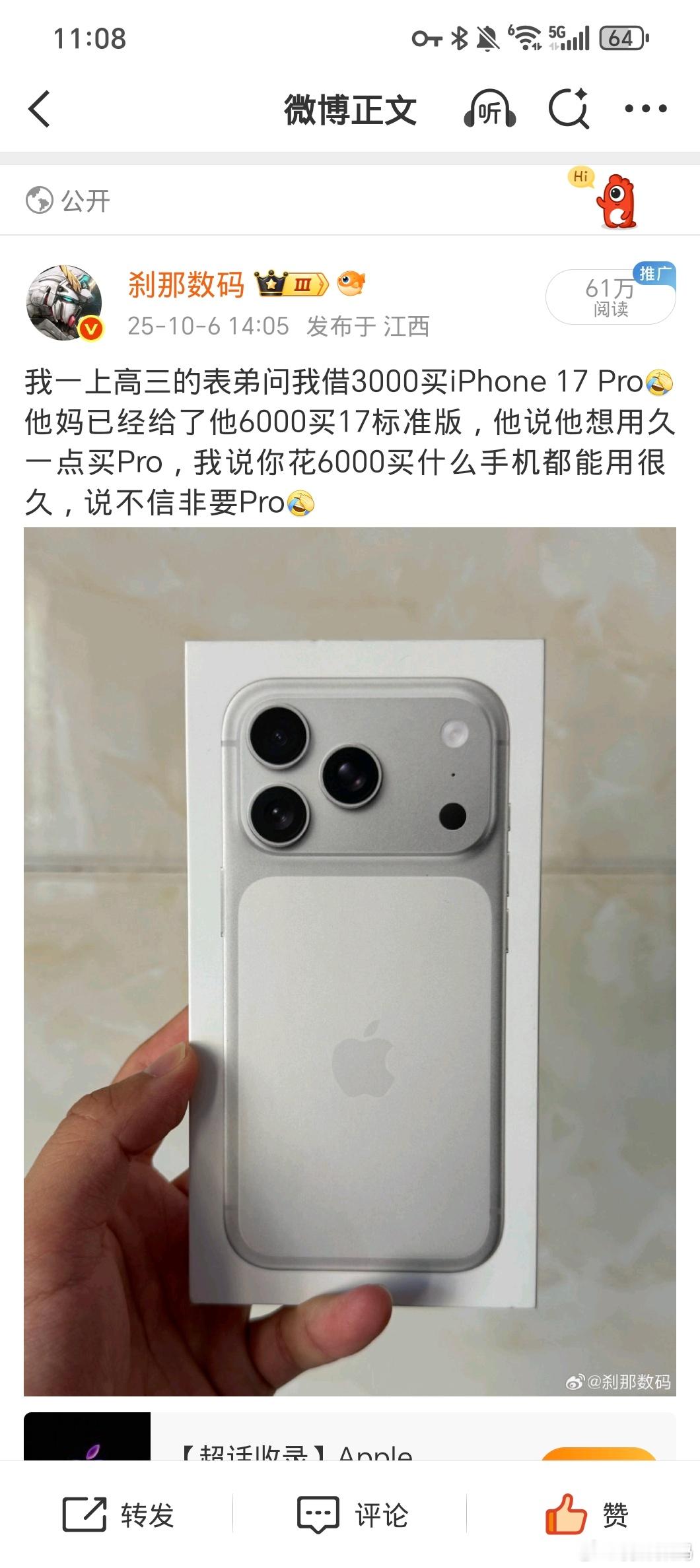 国庆不是借给高三表弟3000买手机吗,我说我自己也会买,让送我个官方透明壳吧当利息吧。(小小年纪不能让他太爽)