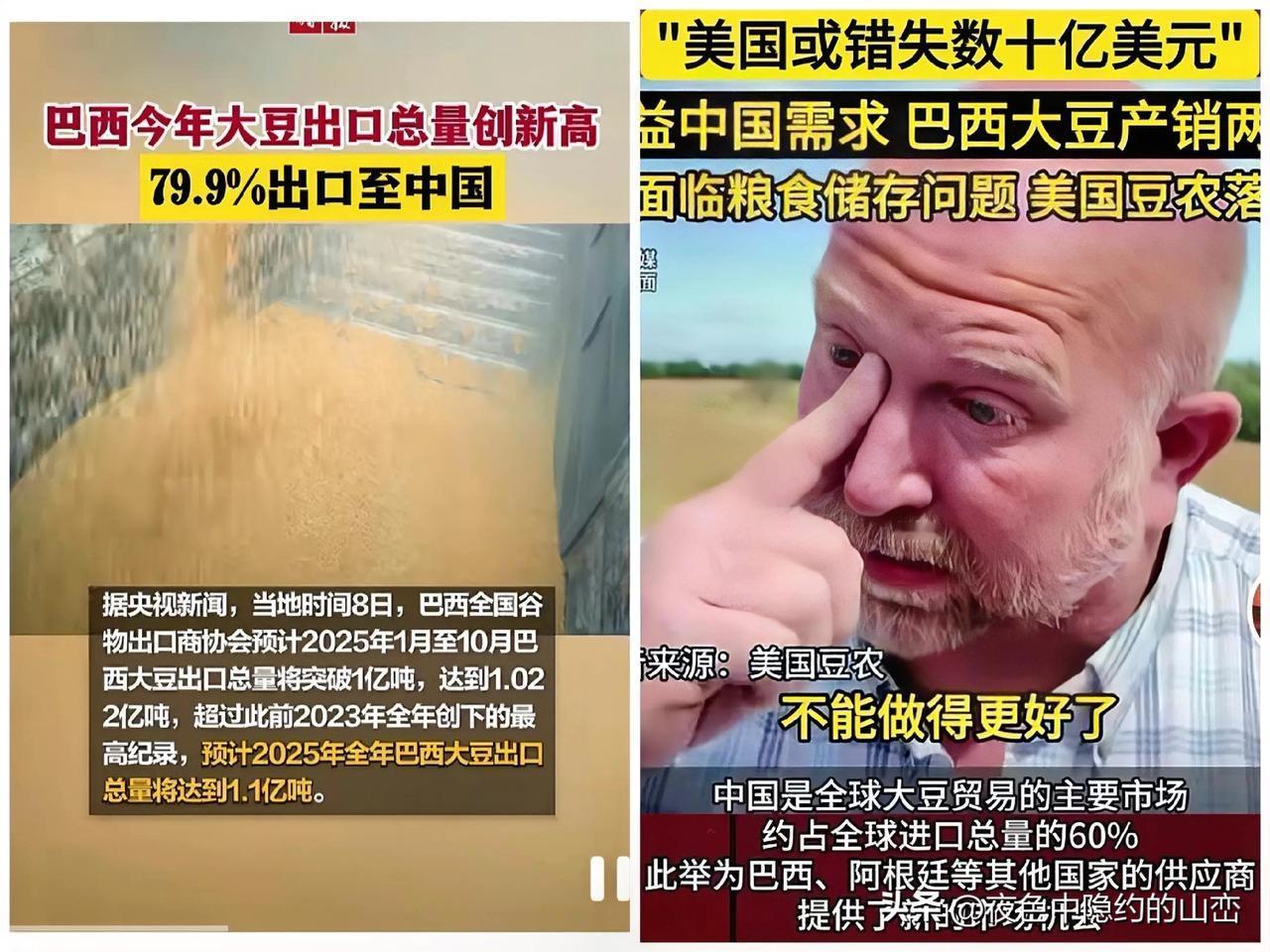 东方大国与巴西合作的这一步 太关键了! 估计这是美国“噩梦”的开始吧! 前10个月,巴西大豆出口量就突破了1.02亿吨,预计全年能达到1.1亿吨。 这对全球粮食市场来说,是一个极具震慑力的数据。要知道,在很长一段时间里,美国大豆都是“老大”,而美国大豆的优势主要体现在对外贸易的稳定性和高质量上。 但是,现在美国大豆还没缓过劲来,巴西的大豆就已经率先“登顶”了。这不仅仅是数据上的“第一”,更是从源头上阻止了美国大豆的“反制”动作。 要知道,美国大豆的最大买家就是东方大国,而东方大国与巴西的大豆关系越来越密切,这对于美国来说,绝对是一个“噩梦”式的开局。 今年,巴西大豆综合体的出口额占到全国农产品出口额的三成多,推动了巴西经济的极大步伐。 而巴西的大豆产量还在继续攀升,这得益于巴西在大豆品种上的研发。目前,巴西大豆的亩产已经达到了3560公斤,而种植面积更是从1993年的千万公顷猛增至四千多万公顷。 并不是所有的种植面积都是通过合法手段获得的,部分土地是通过砍伐雨林获得的,这可能会影响到生态环境。 巴西的大豆出口也并非没有挑战,比如物流问题,比如美国大豆的替代性。 但这些都不是重点,重点在于,东方大国与巴西签署了可持续农业合作框架协议,这指明了未来的方向。 你们觉得美国豆农会“感谢”川普送给他们的惊喜吗? 【免责声明】本文章、图片来源于网络,请仔细甄别,信息内容以权威机构为准!如有侵权,请联系删除!谢谢!