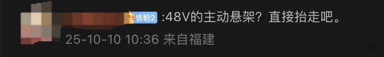 看来悬架领域知识还是欠普及,有人对48V悬架不了解,比如截图的这个留言,我不知道这条留言是不是还以为能用上800V的悬架呢 ,我思考了一下, 其实就是如果你要是听到有人说“为啥不直接上800V悬架,那不是更猛吗?” 这显然不是目前多数企业的主流做法,成本超了。