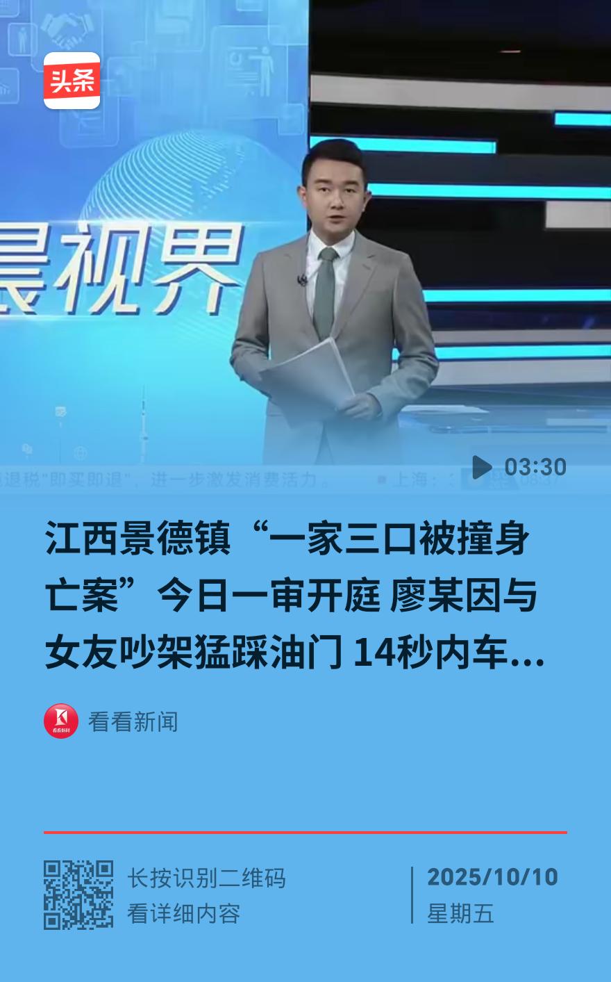 审限期定在10月20日!江西那起因情侣吵架撞死一家三口的案子,终于要迎来关键节点——受害人家属攥着法院通知,只有一个诉求:“廖某某,死刑立即执行!” 可谁能想到,一场口角竟成了三条人命的终点? 老话讲“冲动是魔鬼”,这话在20岁的廖某某身上应验得太过惨烈。2024年10月2日傍晚,景德镇昌江大道的居民区里,本是烟火气最浓的时候。胡家小两口抱着还差7天满周岁的宝宝,正要过马路去孩子奶奶家吃晚饭,桌上早备好的可乐鸡翅还冒着热气。没人能料到,一辆白色轿车正像失控的野兽般冲来——廖某某因为和同车女友吵复合的事闹情绪,竟在限速40公里/小时的路段,把油门踩到底飙到129公里/小时 。 行车记录仪拍下的画面成了家属不敢回看的噩梦:夫妻俩见车冲来,本能地互相推开对方,又同时死死抱紧怀里的孩子,可129公里的时速下,一切防护都成了泡影。三人被直接撞飞,宝宝和妈妈当场没了气息,爸爸送医后也没能救回来。事后有人发现,廖某某撞人后竟淡定抽烟,他的朋友还跑去律师直播间问,说“最多判7年” 。 这一年里,受害老人的日子过得像踩在碎玻璃上。胡女士住进了儿子的婚房,儿童房里的爬爬垫还在,儿媳养的多肉被老伴救活了,可照片里笑盈盈的三口人再也回不来了。夜里一闭眼,全是孩子们喊救命的声音,老两口靠着安眠药才能入睡,重度抑郁把曾经开朗的人熬得没了神采。更让他们寒心的是,肇事方曾托中间人说和,提出拿80万赔偿,还说等廖某某出狱后给他们养老,想换一份谅解书——“我们连孙子最后一眼都不敢看,要这钱有什么用?” 胡女士的 反问戳痛了多少人 。 如今距离审限期只剩10天,这起被检方以“以危险方法危害公共安全罪”起诉的案子,终于要揭开结果。要知道,法律里这罪名最高可判死刑,廖某某在闹市区故意加速、致三人死亡的情节,早已突破了底线。 方向盘里藏着人命,情绪失控绝不是作恶的借口。廖某某一时的冲动,碾碎的是一个家庭的全部希望,也砸毁了自己的人生。10月20日的判决,不仅是给受害家属的交代,更是给所有手握方向盘的人敲警钟:你的情绪再激动,也不能拿别人的生命当泄愤的靶子。毕竟生命这东西,碎了就再也拼不回来了。江西撞死三人案 景德镇被撞案 江西杀两人
