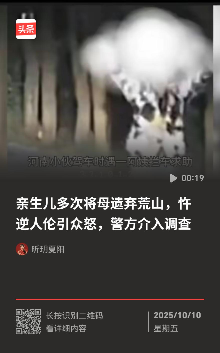 凌晨荒野里,白发阿姨狂奔拦车的身影,藏着比寒夜更刺骨的真相——这竟是亲生儿子第N次把她丢在这儿。 2025年10月的一个凌晨,河南小伙张卫峰开车经过偏僻路段,车灯突然照到个蜷缩的人影。凑近一看,阿姨衣衫单薄,冻得嘴唇发紫,见车就扑上来求救,声音抖得不成样子。张卫峰赶紧拉她上车开了暖风,一打听心都揪紧了:“我儿……又把我扔了。” 阿姨的哭诉里全是绝望。十月怀胎养大的儿子,不知从何时起成了催命的债主。每次被丢在荒野,她都要靠路人帮忙才能回家,这次的地方更偏,黑灯瞎火连条正经路都没有。张卫峰听得眼眶发烫,他实在想不通,“养儿防老”这句老话,怎么到这儿就成了笑话? 送阿姨到家时,张卫峰忍不住多说了两句:“孝顺是根,扔了良心过得去?”这话戳中了多少人的痛处。要知道,法律早把赡养义务钉死了——《刑法》里明明白白写着,遗弃没有独立生活能力的老人,情节恶劣要坐五年牢。多次把老人丢在荒野,这哪是家事,分明是犯罪。 有人或许会找借口说“负担重”,可再重的担子,能重过母亲当年把你拉扯大的恩情?张卫峰的善举像束光,照出了某些人内心的阴暗。百善孝为先,这从来不是空话,是刻在骨子里的本分。 别让生养你的人,老来要在荒野里求生存。赡养父母是义务,更是底线,踩破了这条线,丢的不仅是脸,还有做人的根本。