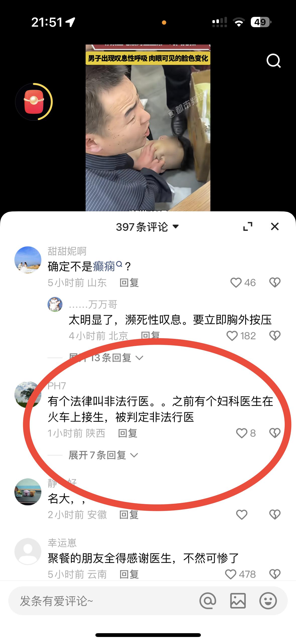 即使这位吃饭的医生好心救人,也有人说他多管闲事挑拨离间 男子在聚餐的时候突然口吐白沫,他出现叹息式呼吸,脸色明显的煞白 把朋友吓坏了,幸好旁边桌有位男士是医生,第一时间抢救,让打120,他不停的一个手掐人中,一个手扒着他的嘴巴,以防咬舌 幸好有这位医生及时抢救,送到医院检查无大碍脱离了生命危险,这些聚餐的朋友也非常感谢这位吃饭的医生!评论区网友却觉得男子在非法行医?难道碰到这种情况好心的医生就该袖手旁观,等到专业的医生来吗?