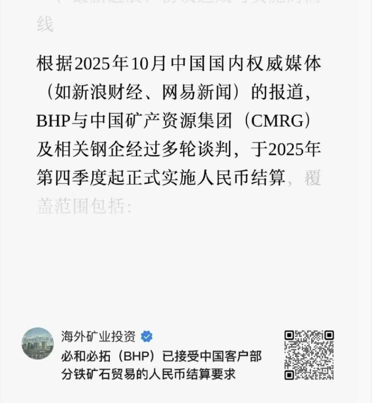 这就对了嘛。据报道,必和必拓已经接受客户部分铁矿石贸易的人民币结算要求。这说明,中国在这一轮的坚持中笑到了最后。 要知道,过去几十年买铁矿石,咱们可太憋屈了。全球近七成的铁矿石都被咱们买走,中国钢铁产量占了世界一半还多,可偏偏话语权捏在别人手里。 四大矿山垄断着七成以上的海运矿石,咱们想买就得按他们的规矩来:必须用美元结算,价格说涨就涨。 2004 到 2008 年那六年,铁矿石价硬生生涨了两倍多,2008 年一年就涨了 65%,光这一下中国钢企就多花了 124 亿美元成本。 那时候咱们想买还得看脸色,人家说美元结算就只能换美元,汇率一波动,钢企又得平白多掏钱,这种 "买得越多越吃亏" 的日子,想想都窝火。 这次必和必拓一开始还硬气着呢,先是坚持美元结算,还敢涨价 15%,真当咱们离了它不行? 好在咱们这次不再是散兵游勇,中国矿产资源集团直接站出来,把国内钢厂的采购权攥到一起,9 月底干脆下了死命令:暂停采购所有美元计价的必和必拓铁矿石,不管是已经飘在海上的,还是正在装货的,一律按新规来。 这一下就戳中了必和必拓的命门 —— 它每年产量的 60% 都得靠中国市场消化,咱们不买,它的矿石往哪儿卖? 必和必拓这下是真慌了,没过多久就乖乖坐回谈判桌。最终的结果特解气:从 2025 年第四季度开始,它对华的现货贸易全改用人民币结算,这部分占了它对华供应的 30%。 就算是长期协议暂时用美元,但得用咱们的 "北铁指数" 当价格参考,还设了观察期,要是明年咱们的指数能站稳脚跟,长协也得谈人民币结算。这哪是妥协啊,分明是给咱们的人民币铺路呢! 更解气的是,这事儿一传开,其他矿企跟着就松口了。力拓早就先一步接纳了人民币,巴西淡水河谷把对华贸易的人民币结算比例从 2023 年的 12% 一下提到了 27%,后来干脆说要升到 50%,还专门在中国建了人民币结算中心。 俄罗斯更直接,对华铁矿石出口快一半都用人民币了,印度矿企为了抢生意,甚至搞出 "用人民币付账给 5% 折扣" 的活动。这就是咱们的市场底气,你不接受人民币,有的是想合作的人来补位。 可能有人问,必和必拓为啥愿意改规矩?说白了还是为了钱。以前用美元结算,澳企每年光汇率波动就得亏 12 亿澳元,搞对冲操作还得多花 40% 的财务成本。 改用人民币后,必和必拓的资金周转率一下提升 35%,一年能多赚 2.1 亿美元。拿到人民币后,他们既能去香港换成美元,也能直接买中国的矿车、设备,或者在上海买黄金,钱能直接用起来,比绕着美元转方便多了。 这背后最关键的变化,是人民币在铁矿石贸易里的分量越来越重。2023 年的时候,人民币结算占比才刚到 5%,谁能想到两年后的 2025 年就飙到了 25%?上半年更是冲到了 28%,远超年初 15% 的预期,照这速度,2026 年底突破 40% 根本不是问题。 更妙的是,这股势头还传到了下游,2025 年 1 到 8 月,咱们钢材出口的人民币结算占比都到 18% 了,比 2023 年多了 11 个百分点,形成了 "买铁矿用人民币,卖钢材也用人民币" 的闭环,这下美元想插手都难。 别小看这结算货币的变化,这可是在敲美元霸权的根基。过去全球铁矿石贸易 85% 都用美元,形成了 "挖资源换美元、存美元买美债" 的循环,咱们只能被动跟着走。 现在不一样了,资源国拿到人民币能直接买中国的汽车、机械,不用先换成美元,等于绕开了美元的中间盘剥。 就像澳大利亚,不光铁矿石开始用人民币,连羊毛、大麦都完成了人民币结算系统对接,首批 2 万吨大麦已经运过来了,这就是实实在在的改变。 有人可能会说,现在人民币占比还没到一半,是不是高兴太早了?但咱们得看趋势啊,从 5% 到 25% 只用了两年,这速度谁能想到? 而且咱们手里还有后手,几内亚的西芒杜铁矿年底就要投产了,到时候供应渠道更多元,咱们的腰杆只会更硬。 更别说人民币已经成了全球第五大储备货币,占比从 2022 年的 2.88% 升到了 4.12%,越来越多国家愿意拿着人民币。 以前咱们采购分散,各钢厂自个儿讨价还价,根本形不成合力;2022 年成立中国矿产资源集团后,终于能攥成一个拳头说话,再加上找俄罗斯、巴西这些新货源,才有了跟必和必拓叫板的底气。 这次暂停采购的果断出手,让全世界都看清了:中国市场不是想来就能来、想走就走的,想做咱们的生意,就得按咱们的规矩来。 这事儿真得给咱们国家点个赞!几十年的被动憋屈,终于靠着一步一个脚印的坚持给扭转过来了。 必和必拓接受人民币结算只是个开始,往后在全球大宗商品贸易里,人民币肯定会越来越吃香,咱们的话语权也会越来越重。 这哪是简单的生意谈判赢了,这是中国实力的最好证明,咱们就是凭着这份坚持,实实在在笑到了最后!