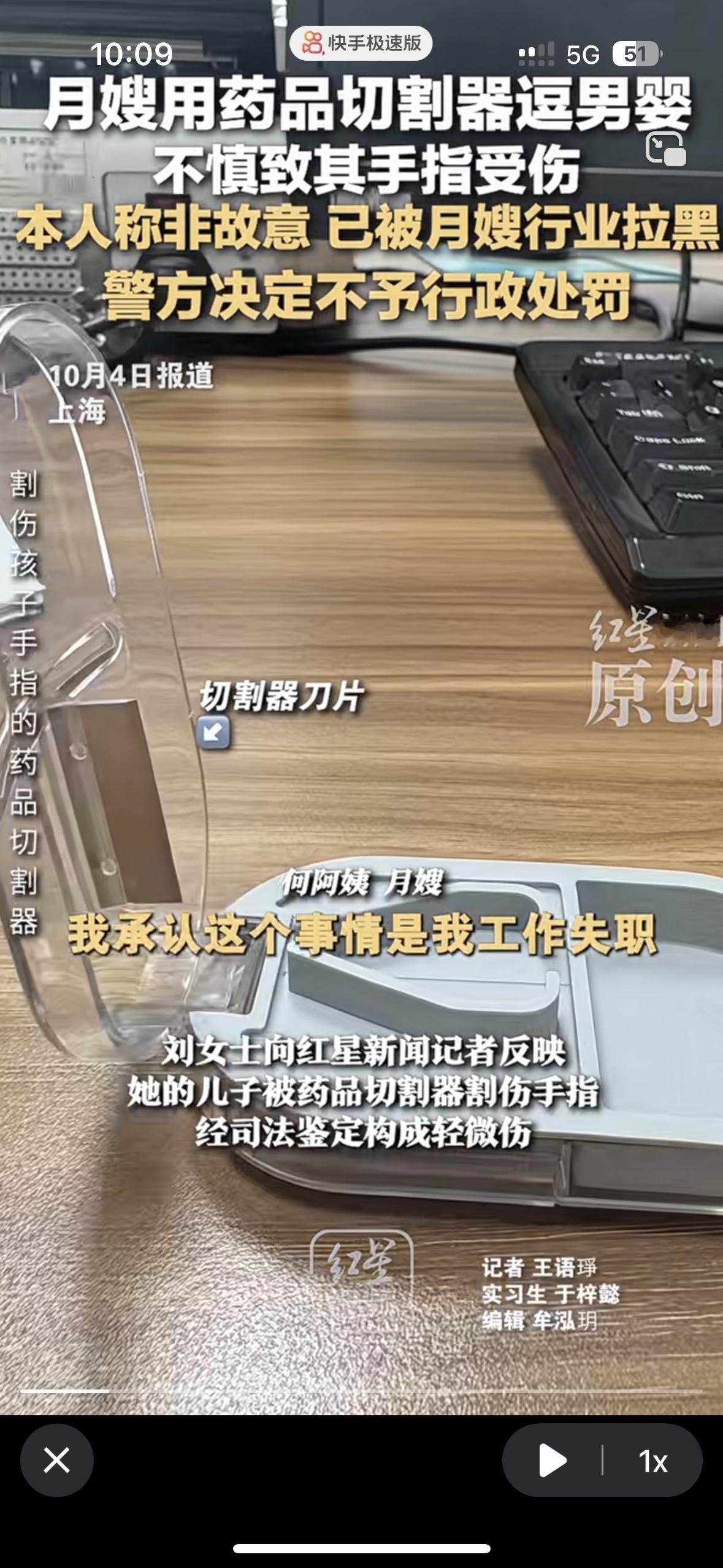 如果这是亲妈,谁来追责呢!何必赶尽杀绝呢? 未免也太小题大做了吧?月嫂抱着9个月的孩子玩,拿了个药品切割器逗孩子,不知道药品切割器里有个刀片不小心把孩子的手指划破了 人都会犯错,月嫂已经很自责了!并且她也不是故意的,从她的角度根本没看到有刀片,还主动承担了 医药费 没想到宝妈会报警,还让公司把月嫂拉进了黑名单,为什么要赶尽杀绝断人财路?做人留一线日后好相见