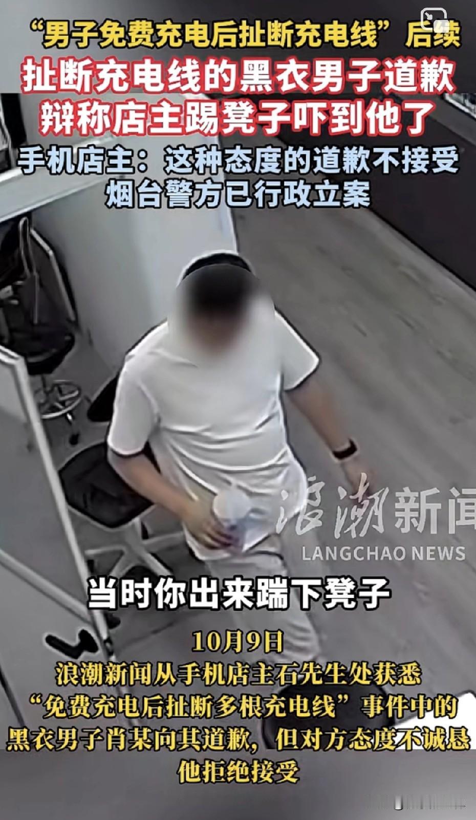 都道歉了还在要面子!男子一行四人免费充电后手撕数据线后续来了,黑衣男作为全程的作案者,一开始是不承认的,后来媒体发酵后道歉,在10.9日和店主打电话表明态度,但是吧…… 你道歉就要有个道歉的样子,黑衣男居然说是店主踢凳子吓到他们在先,于是就有了后面的撕数据线。说实话就这么踢一下对凳子,就吓到你了,这理由太别扭分明就是找借口找台阶。 记住了,成年人要学会思维方式考虑,道歉就要真诚。