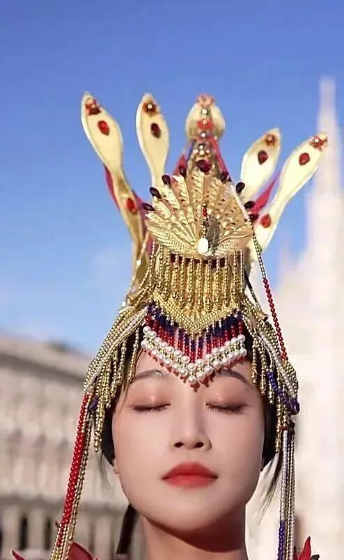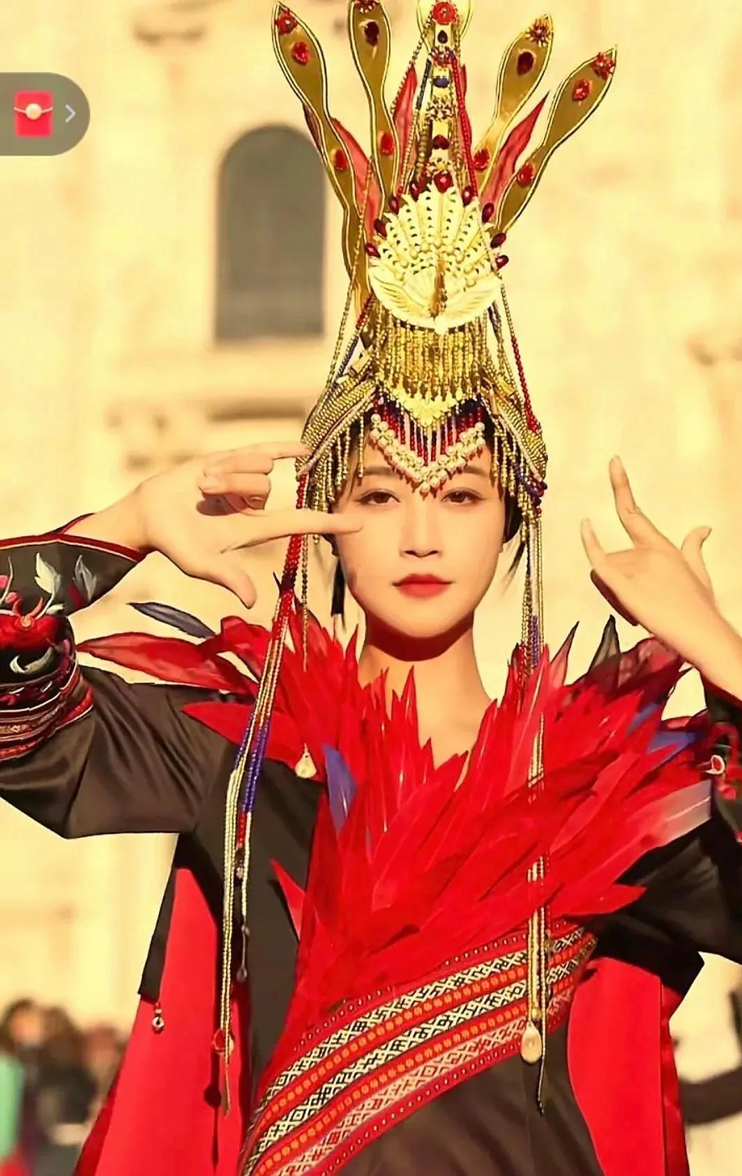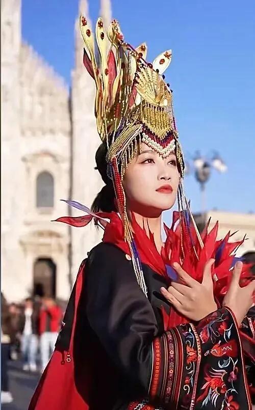 蓝盈莹穿畲族战袍在米兰杀疯了! 米兰街头,蓝盈莹一身畲族战袍太吸睛!黑金红配色超高级,金冠华丽又庄重,红披风一甩,气场直接拉满,把东方民族美狠狠秀到国际上,美到失语! 蓝盈莹 畲族服饰